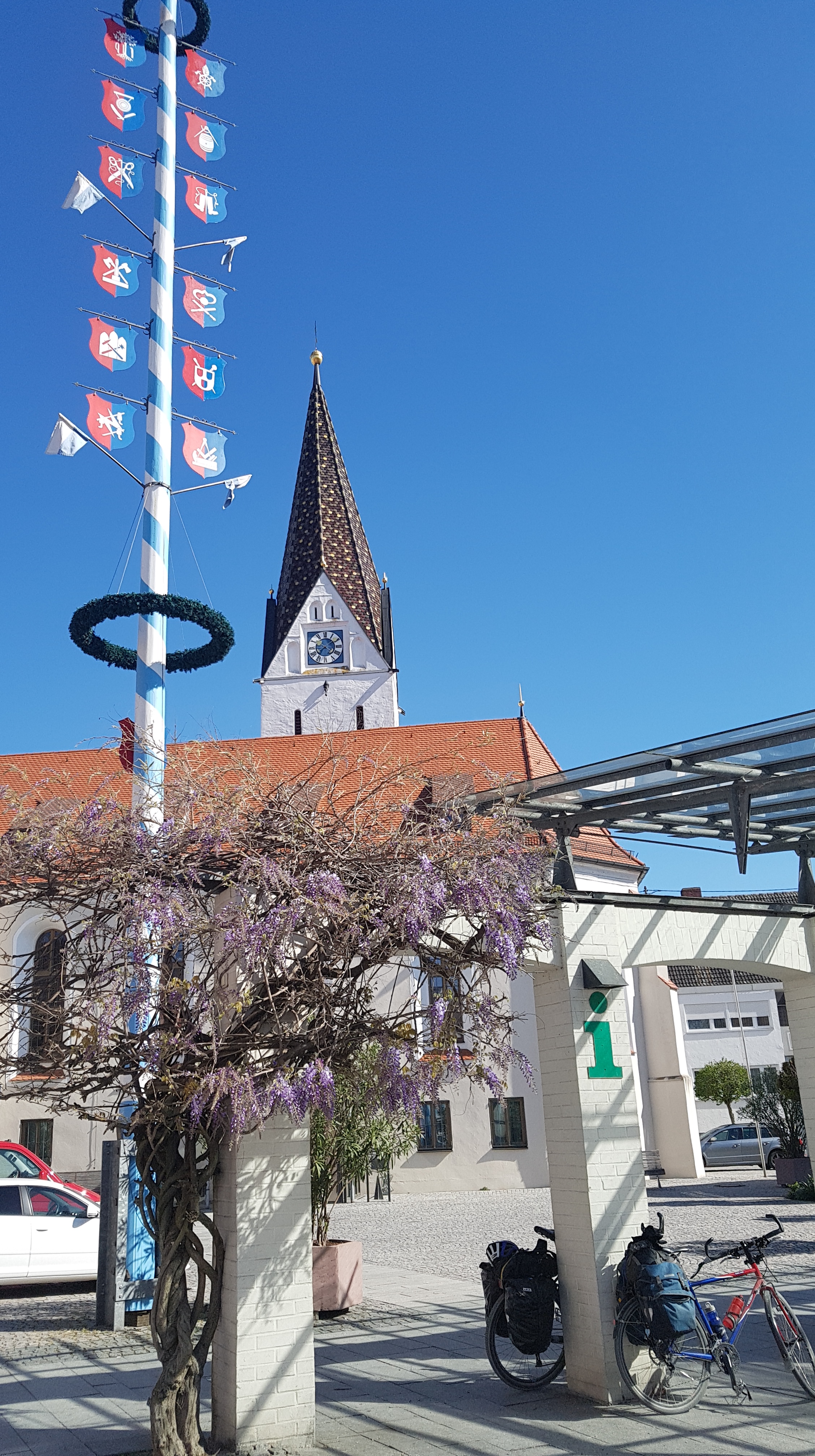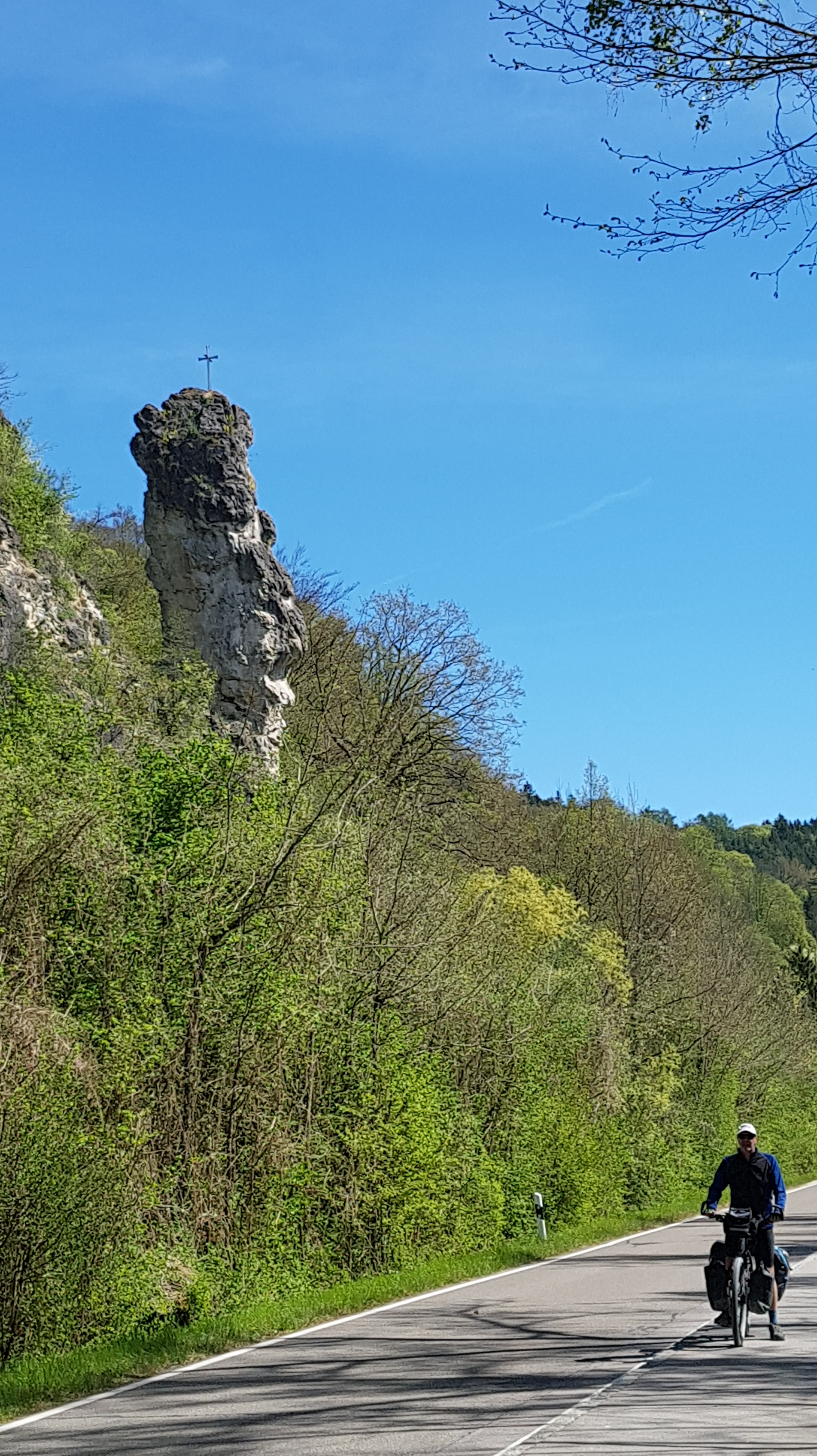 A scenic ride to Kelheim we took the signposted Donau route although there were many variations some without any hills. A great coffee spot in Vohburg mid morning in the historic market square with all the wisteria starting to flower.A few gentle hills took us through the hop growing areas, the hops just starting to climb up their wires/trellises. As we approached Weltenburg Abbey we encountered hundreds of cars trying to park and crowds of people. Weltenburg Abbey is obviously where you go on Easter Sunday.!! We didnot even attempt to visit the abbey, impossible with our fully laden bikes, even though the thought of the famous abbey beer was tempting, brewed since 1050.