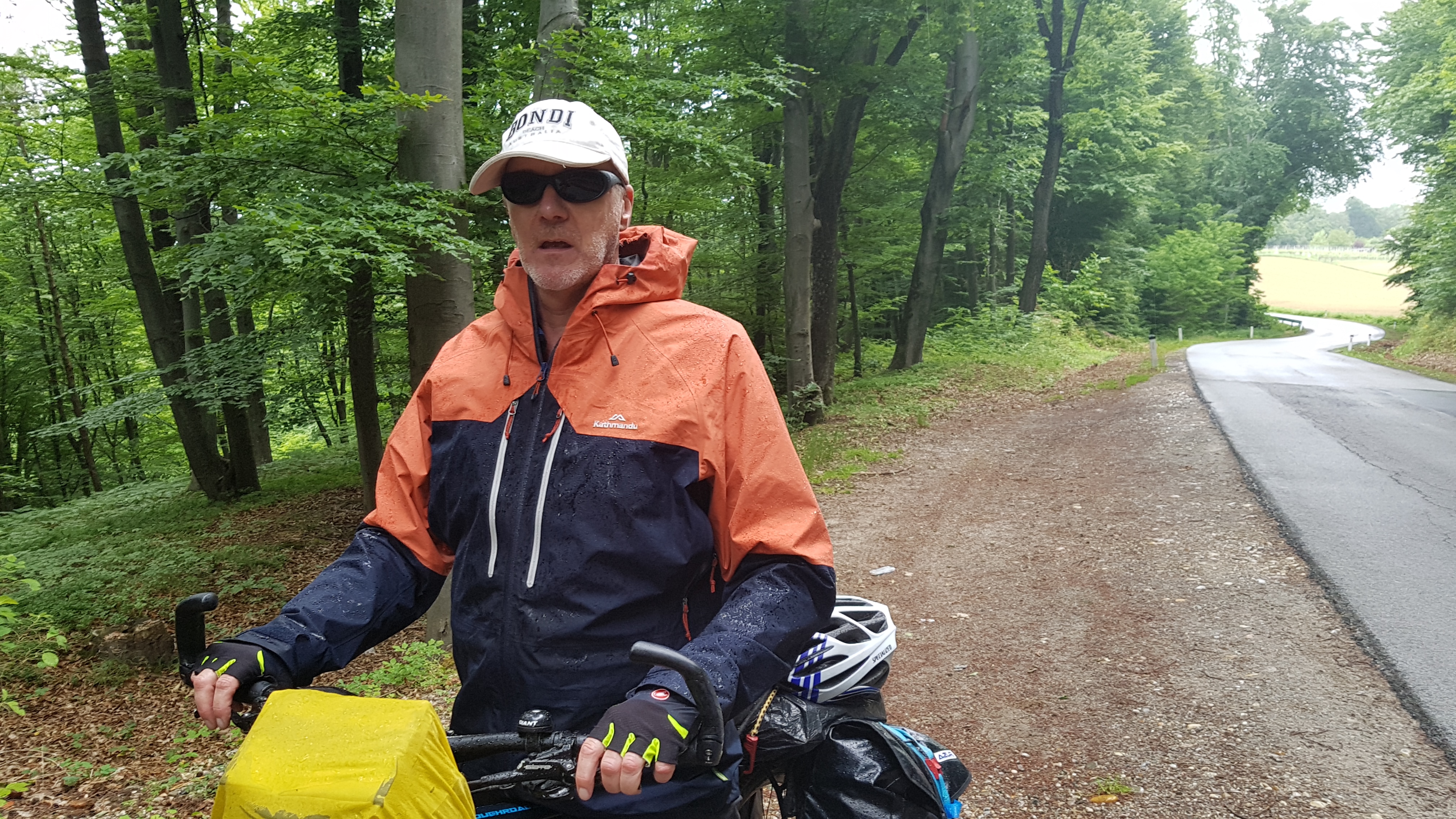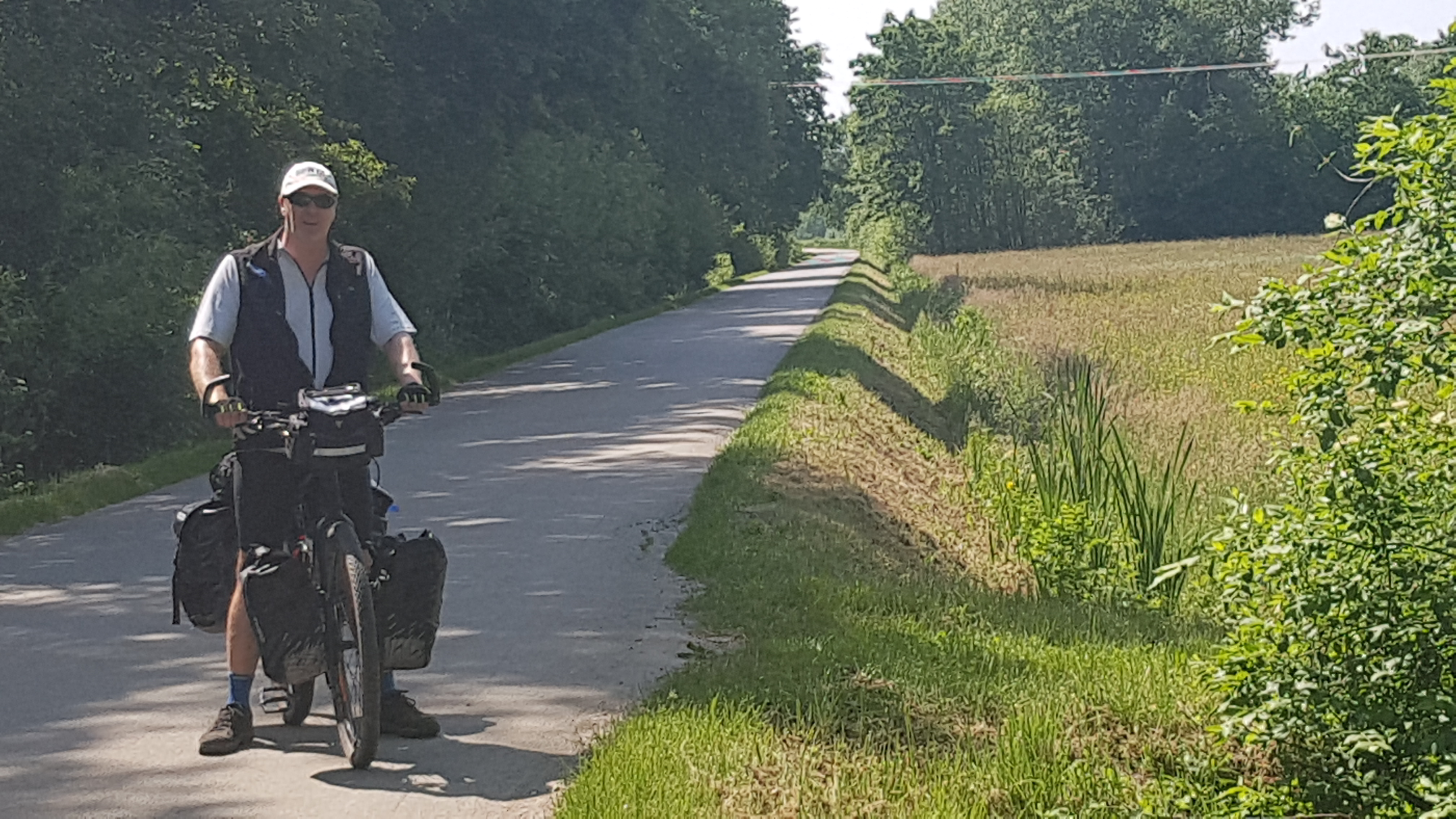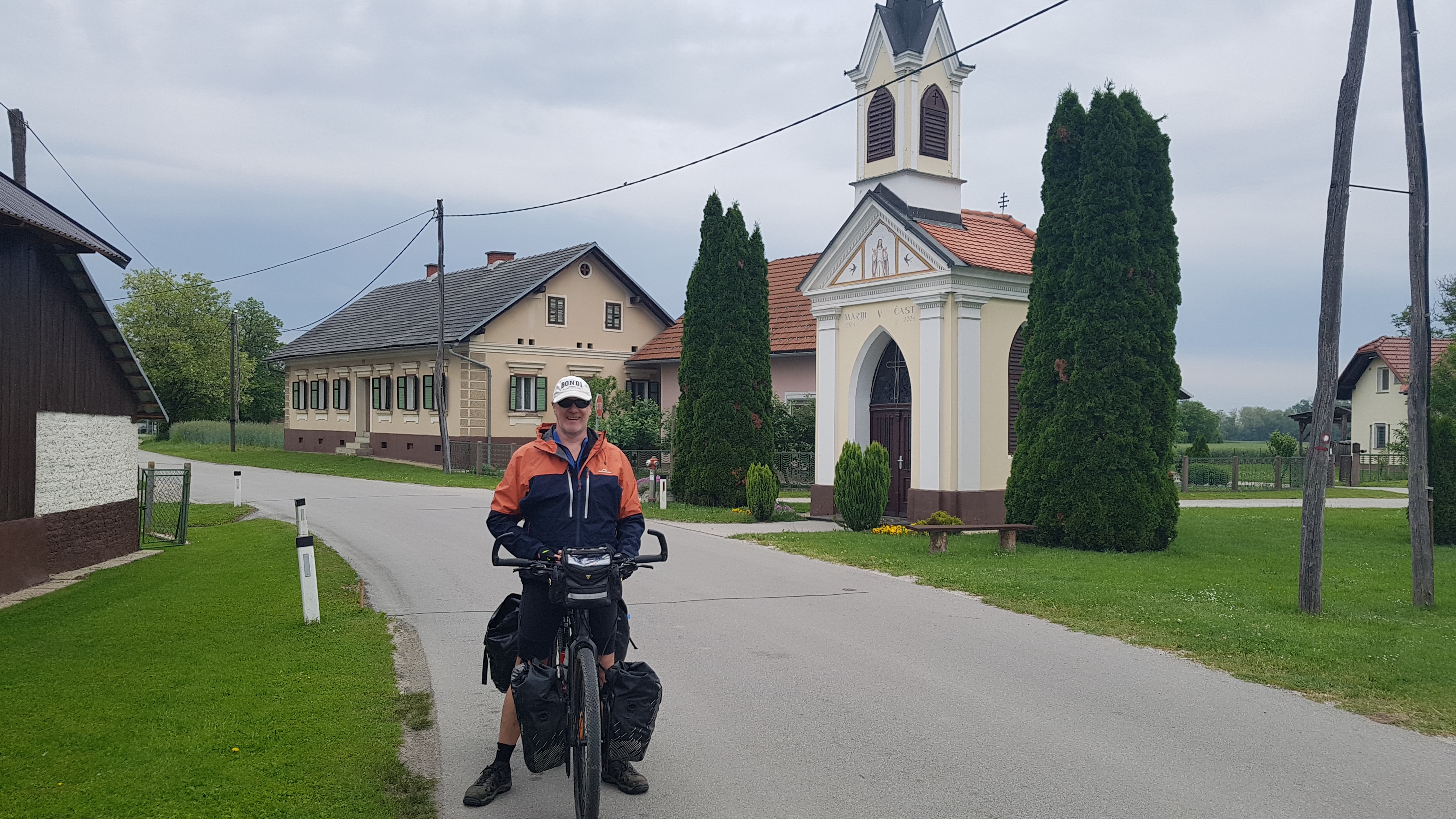 A beautiful cycle track through the forest took us through to the village of Krapje and then it was only a few kms to Banovci where I’d booked a night on a tourist farm. I was not looking forwards to it but it was fantastic newly renovated with a balcony even a washing line on it for us, and a view out over the farm. I was welcomed with a glass of honey schnaps and they sold honey to die for but I would have died if I’d added it to my luggage.Hubby settled down to a movie, yes even english movies on the tv, what a treat.A peaceful nights sleep and we woke to a cloudy day. It was meant to be just a bit of drizzle forecast for lunchtime. Breakfast I tried what I thought might be spring water, no it was schnaps. Schnaps for breakfast!!Then I thought Id try what looked like minced egg white, no it was lard dripping disgusting..More honey was required to get rid of the taste.