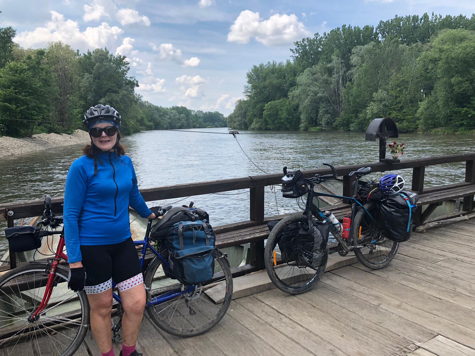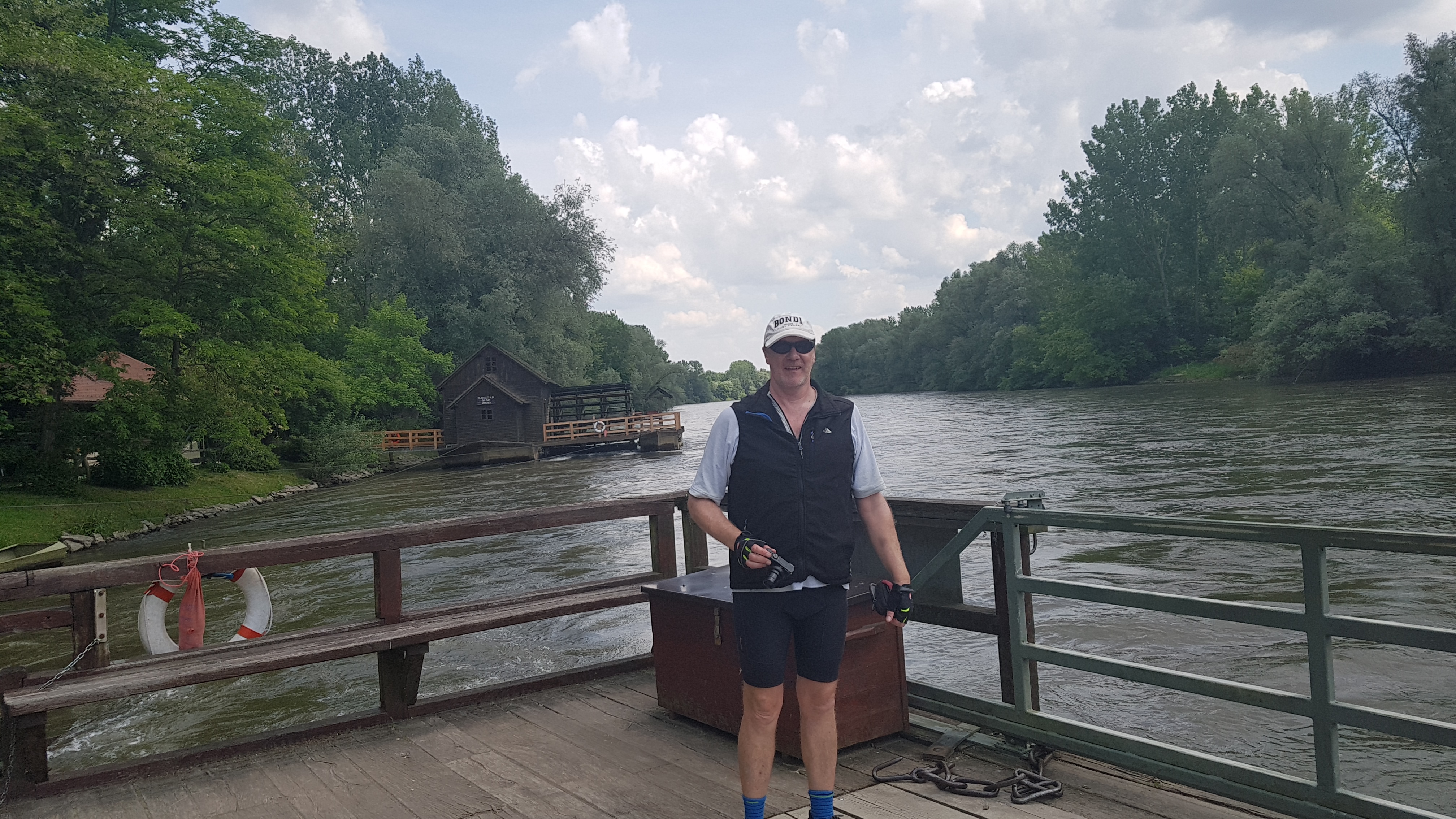 After lunch we headed off to Izakovci where there was meant to be a ferry across the river Mur and a historic water wheel. We reached the river which was surging past almost in flood but no sign of any ferry. So hubby went off taking photos muttering away “we”ll have to cycle all the way back up to the road and then all the way around to a bridge, its going to take hours”. Meantime a lady popped out of a wooden hut and started talking about where we were cycling to and from, in german. So I mentioned we thought there was a ferry here and she replied yes there is, I sell the tickets and just a little further down there was a barge ferry on a cable wire across the river driven by the current. A lot more relaxed then german or hungarian ferrys we were told to board without any crew on first and allowed to disembark when it was only half tied up.The cost a mere 3 euros and it ran just for us!