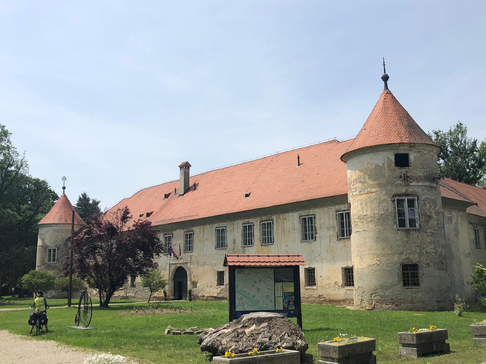 We did get a little lost in one village so had to resort to google maps as there was not one signpost within the village of where to go. Our planned lunch stop was in Beltinci but as we peddled through we didn’t see any restaurants open. We stopped at a pub and as they weren’t cooking any lunch the owner directed us to a castle in the park. Yes, in german as german still seems to be number 2 language even in Slovenia.Hubby was in disbelief as the castle was derelict in parts, when I said there was meant to be a restaurant in there. Sure enough I found it, there was no sign or anything. Great lunch and nothing fried .3 courses for the pricely sum of 9 euros each, no charge for bread and tap water was freely supplied, great.It seems the castle is being renovated and they already have some rooms ready for you to stay in.