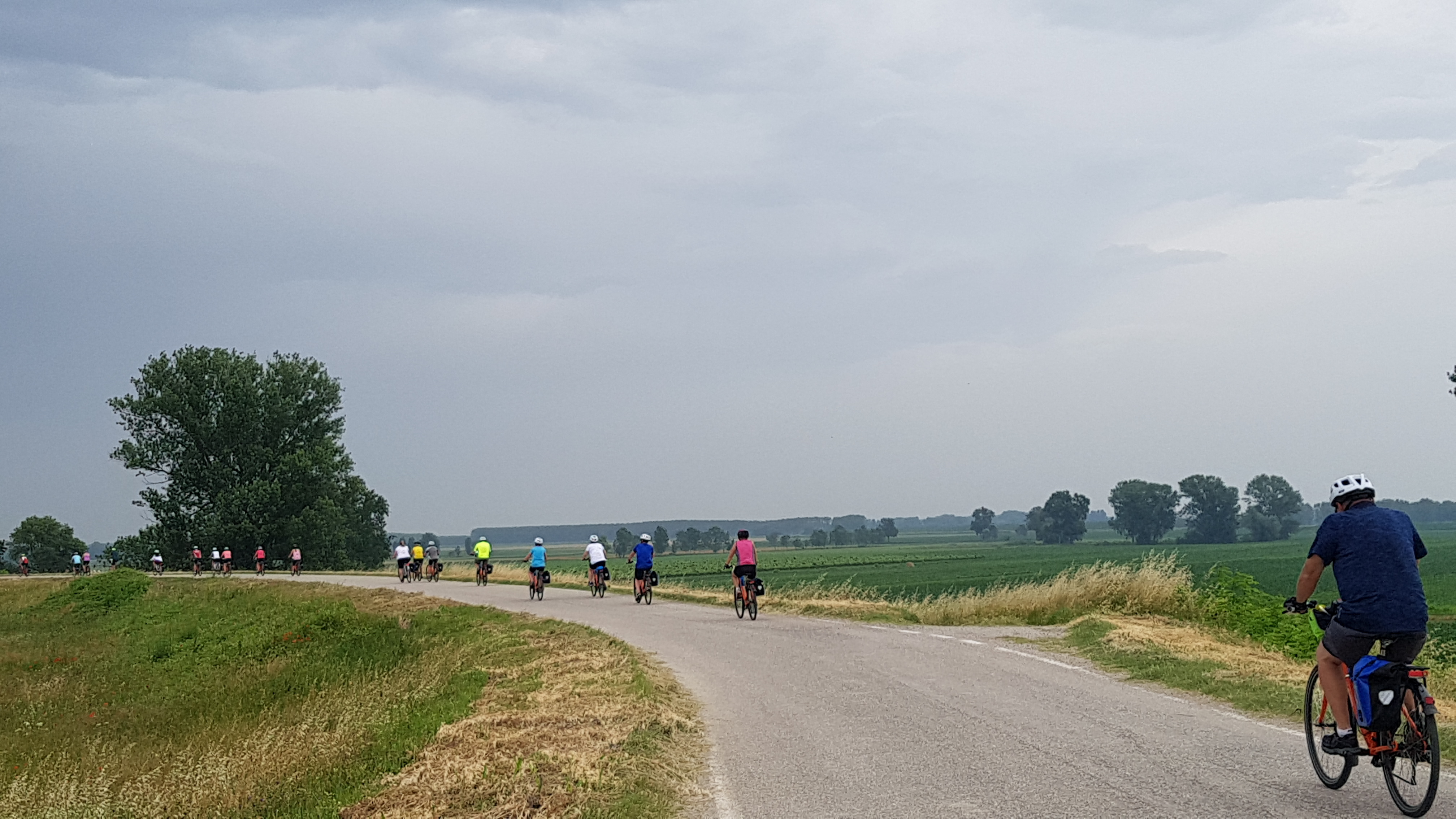 The hotel Doria we stayed in Ostiglia was full of cyclists, 6 Italians and a canadian couple. All were of a similar vintage to us. The hotel did have a swimming pool and was close to the main river Po track, plus the big lock up garage so perfect for cyclists. The canadians were on a 6 week trip and had already covered an impressive distance, but they hadn’t had many days off. Views below of leaving Ostoglia.