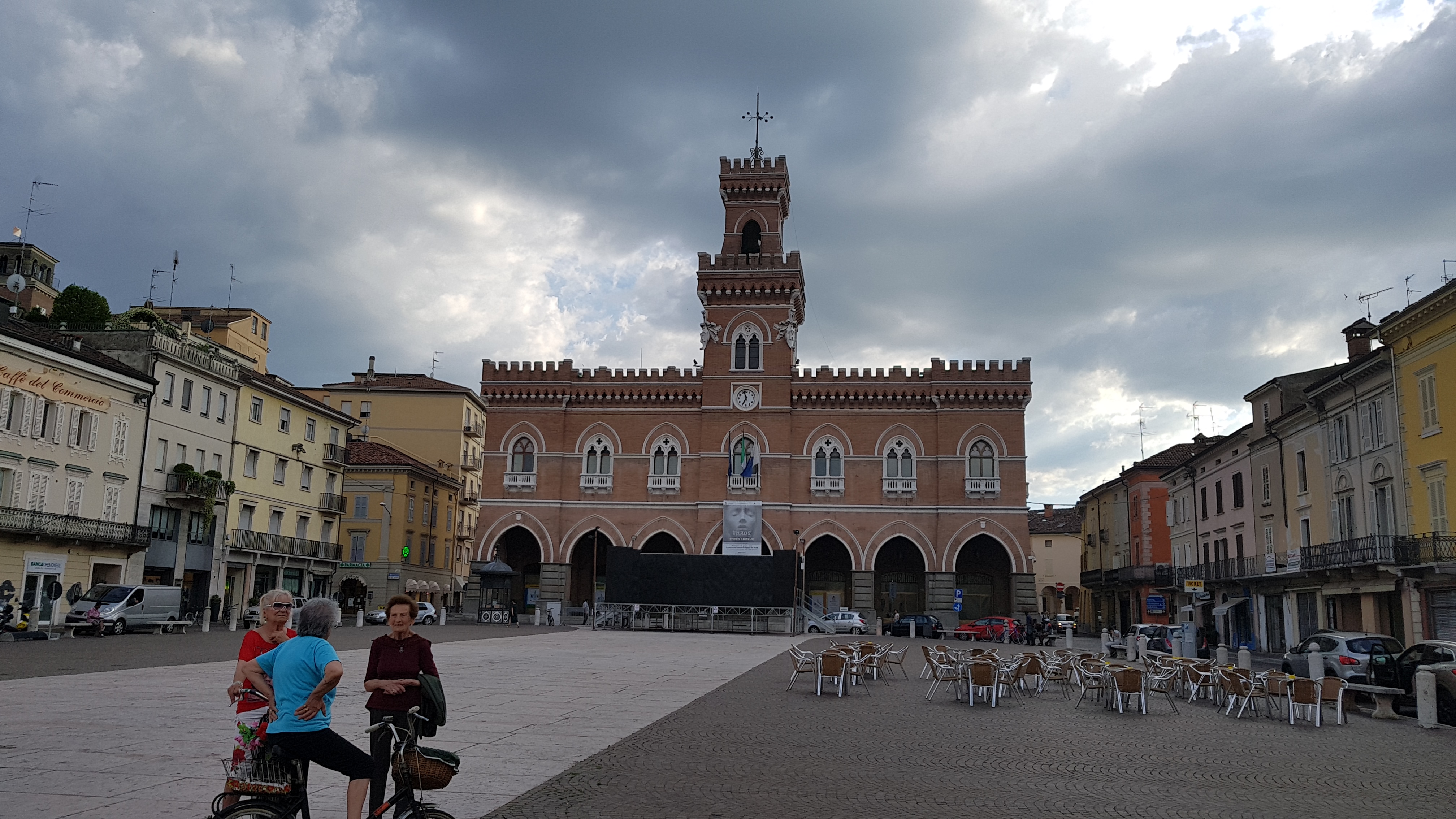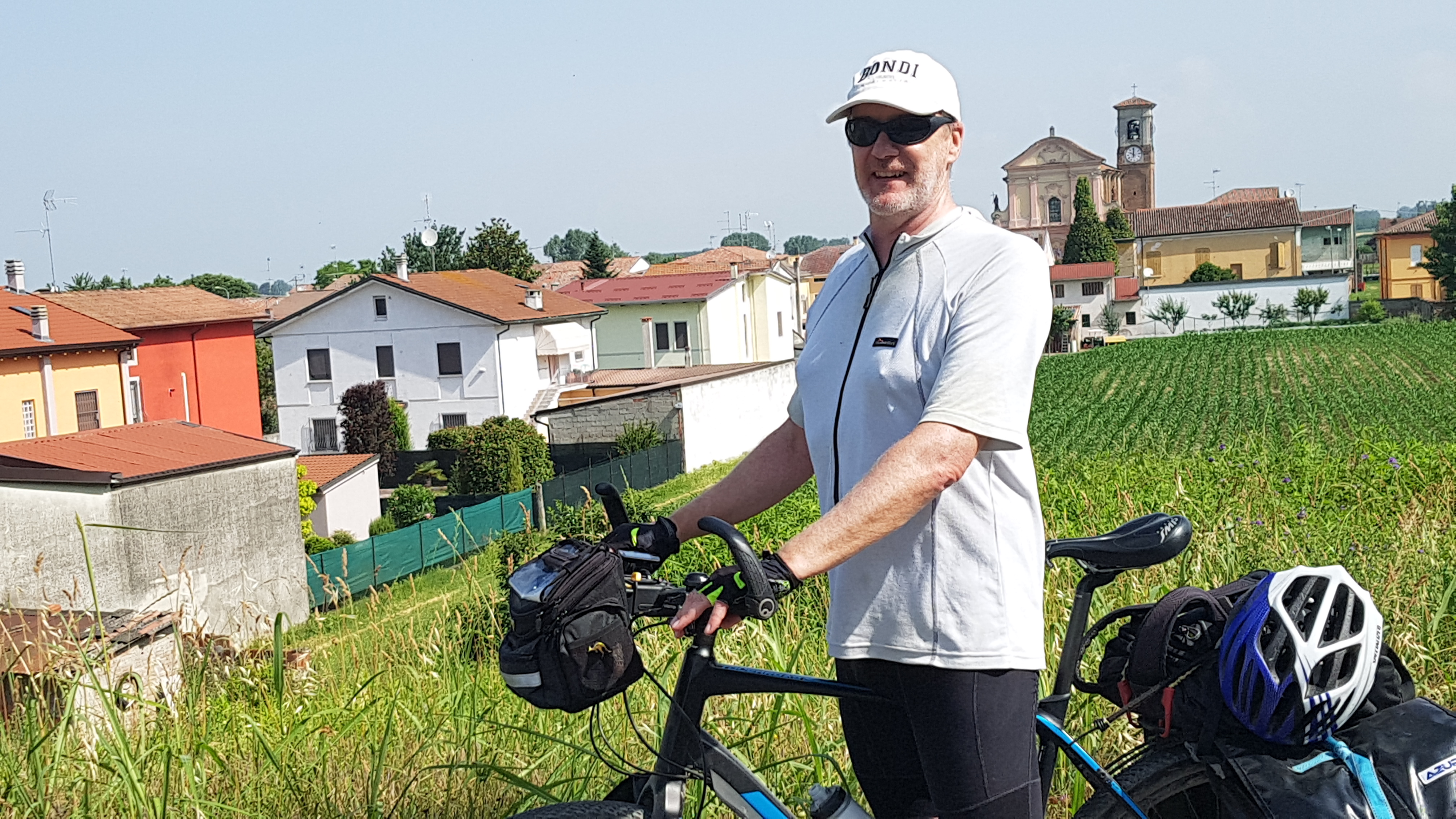 Lunch we arrived in Caselmaggiore and having our bikes loaded up with luggage limited our choices of restaurants , so not the gourmet experiences of Mantova.The heat and humidity was increasing so we were glad of an early check in at our bed and breakfast. Later in the cool we wandered around the town and went up to the Po river where the owners husband was coaching rowing teams. He came to Tasmania in 1980 to compete in a rowing competition and had competed in the olympics.