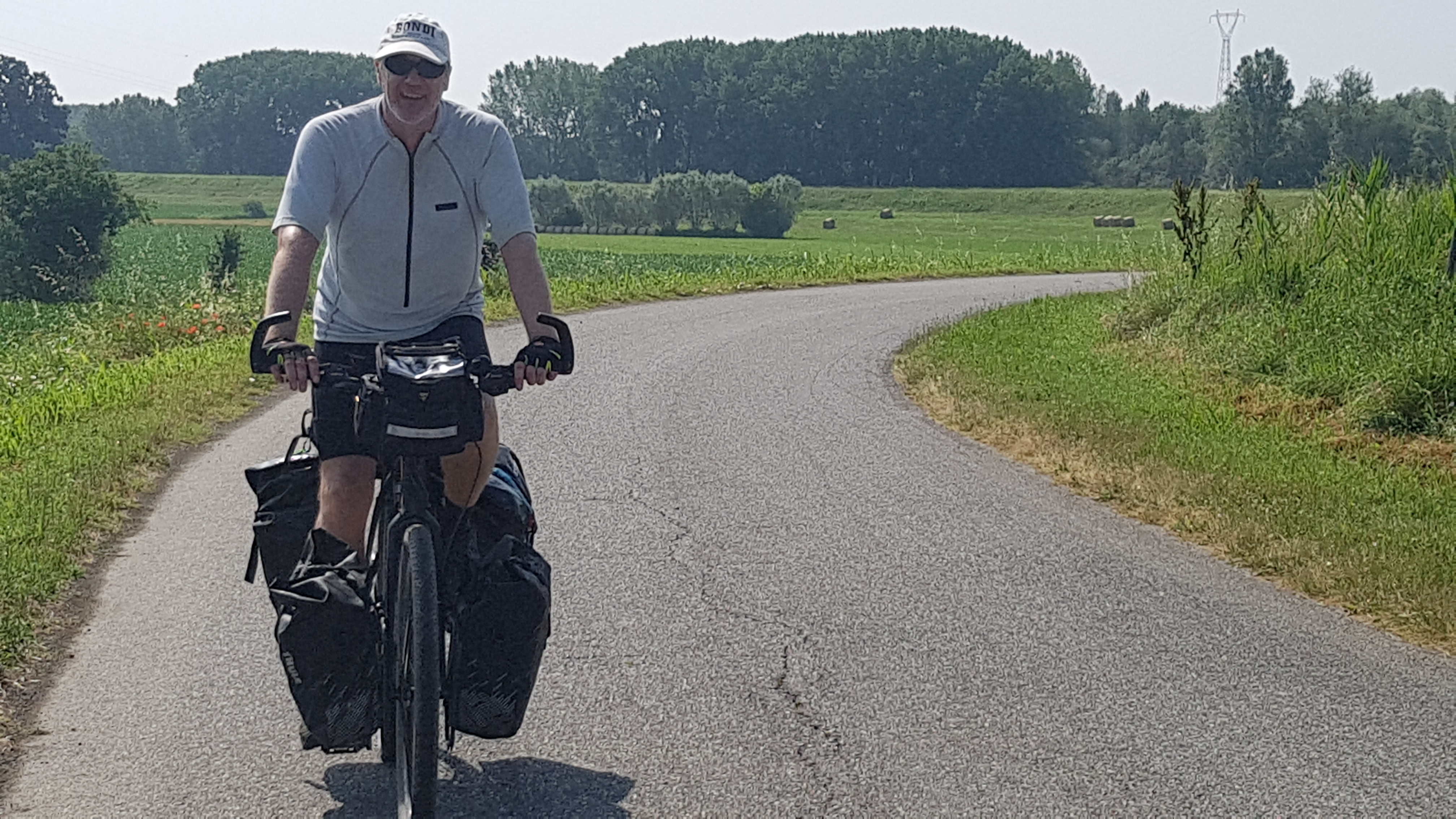 We set off as early as possible with breakfast at 7am it wasnt that early but it wasn’t as humid today and we were more loaded up with water. There were a few signs as we left Casalmaggiore and that was it . We were left with a maze of dykes and country lanes and no signs .We had managed to get an overview map from the tourist bureau in Casalmaggiore but it didnt have the fine detail you really needed with no signs. So many a junction we were huddled in the shade trying to see google maps and where to go.