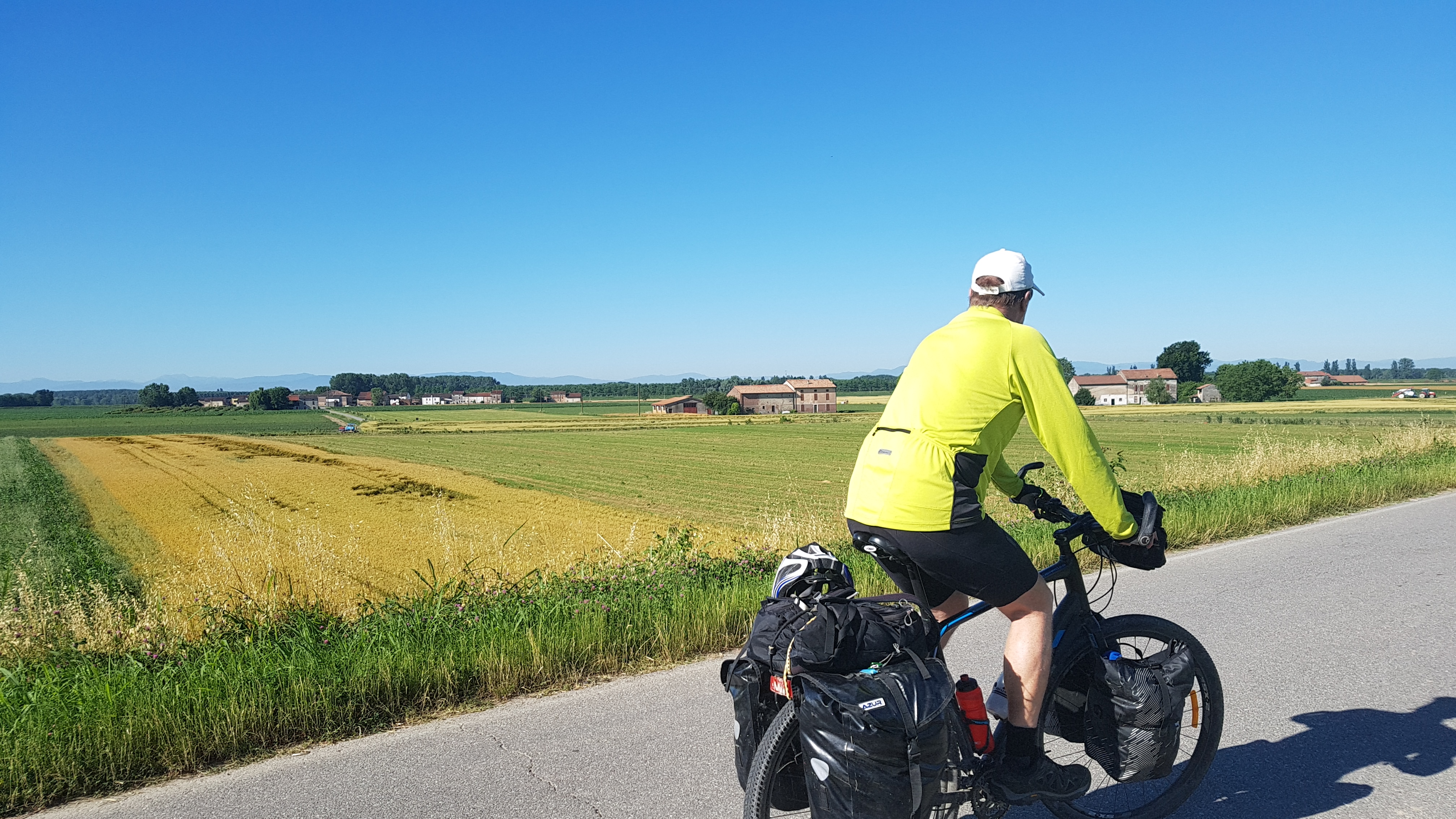 The most exciting event today was suddenly realising mountains were visible. We were heading towards the Alps and could see snow covered peaks in the distance,Tractor report of day, 7.The worst one had a load of grass on the back of his wagon that was flying off over us. I think the use of raw manure or sewage on agricultural land is forbidden in the EU but at times it certainly smells like it as we cycle past,
