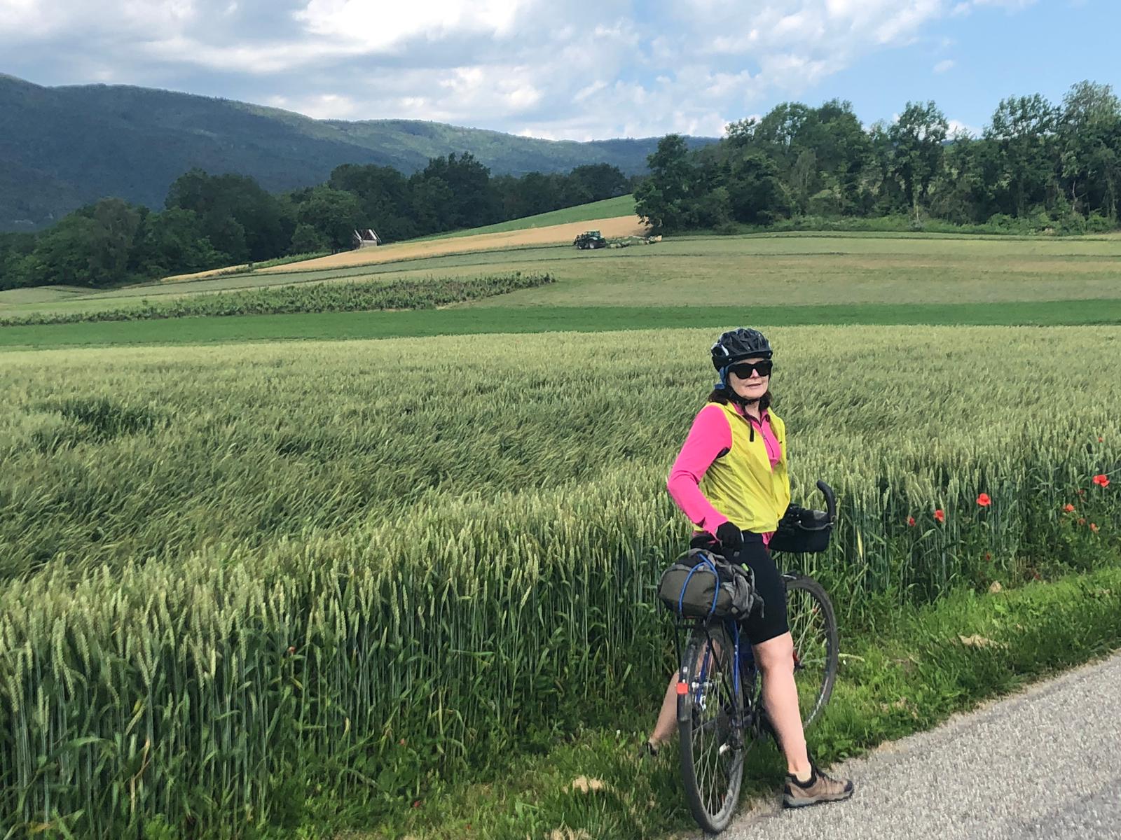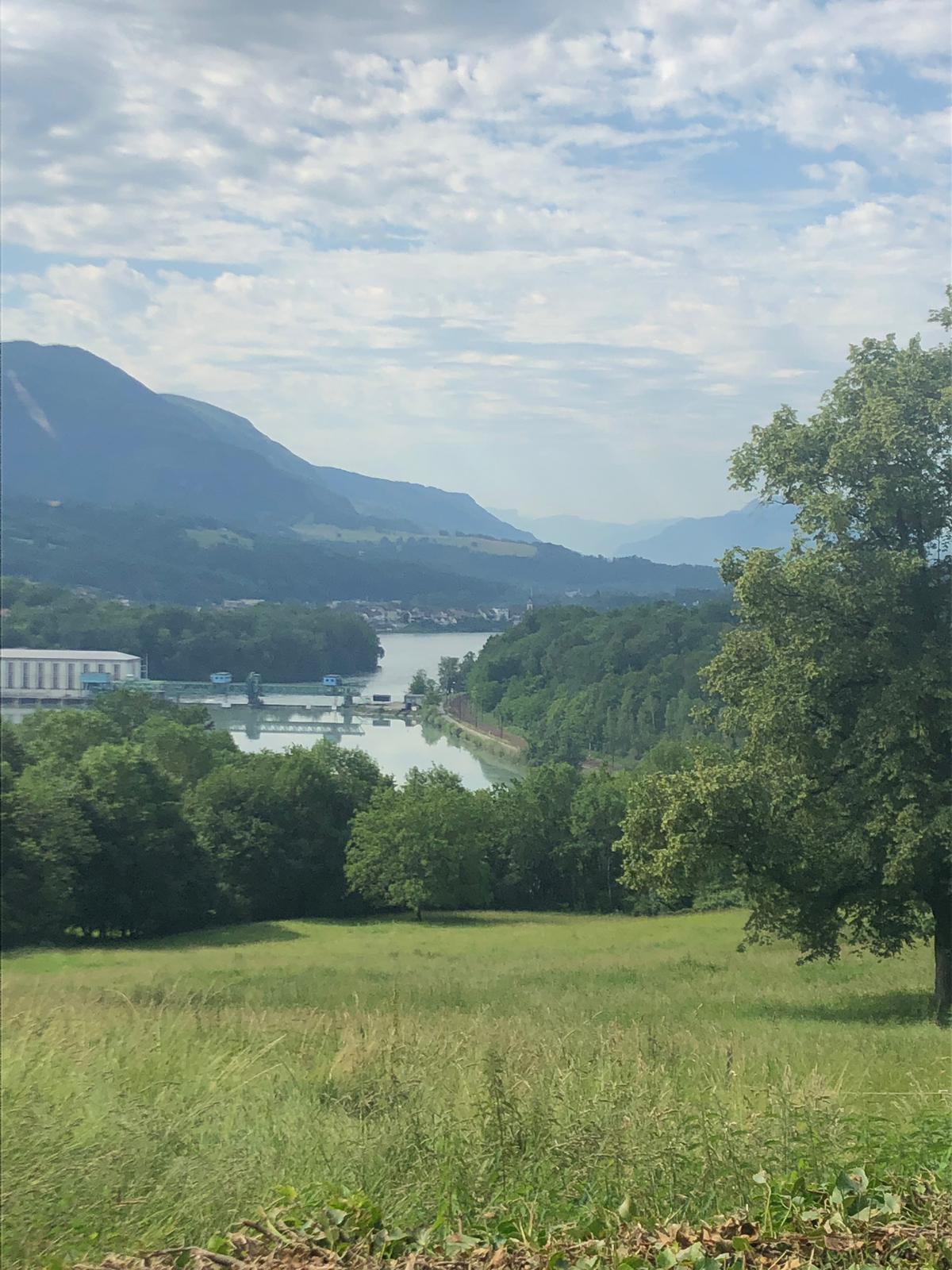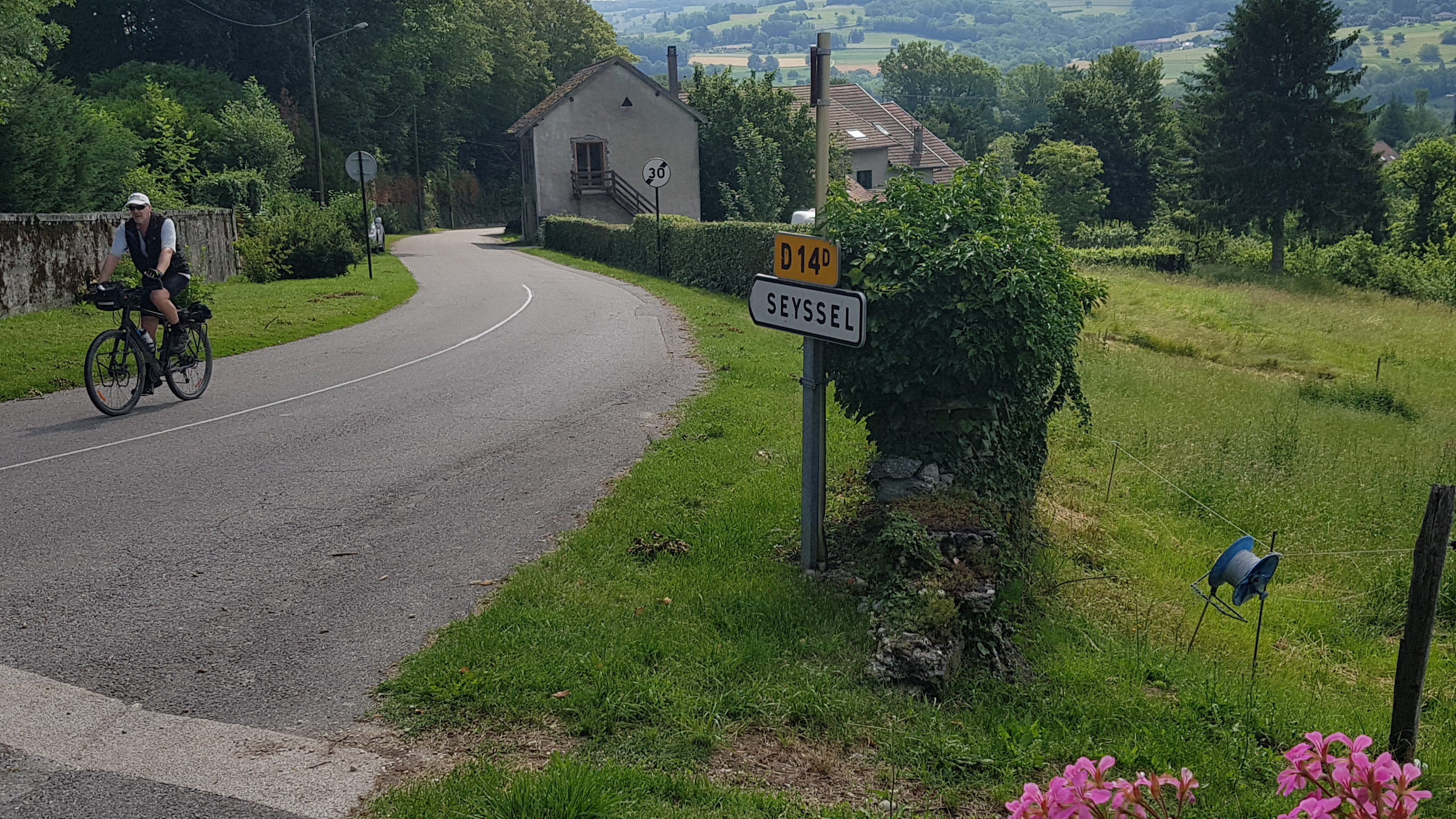 Well the following day we started cycling back towards Geneva from Seysell to complete the section we had missed by catching the train but it was by the side of a very busy road and we thought we don’t really need to do this. So we turned off into some beautiful country lanes, they did go up for about 5kms but it was a gentle up. It was lovely to see cows in the fields munching away, all of the ones we saw in Italy had been jammed into tin sheds with a few fans running on them to keep them cool.And to also enjoy the countryside without the terrible smell in Italy ,of what seemed like raw sewage, fields just soaking in it. Just beautiful scenery here with hills all around. We had lunch at a hotel overlooking the river Rhone, a midday special. Gorgeous food 4 courses for just 14 euros tap water supplied and free fresh bread, yes its good to be back in France.The starter hot goats cheese on salad was lovely not the really strong chevre we had in tne Loire Valley.As for the third course which was the cheese course…