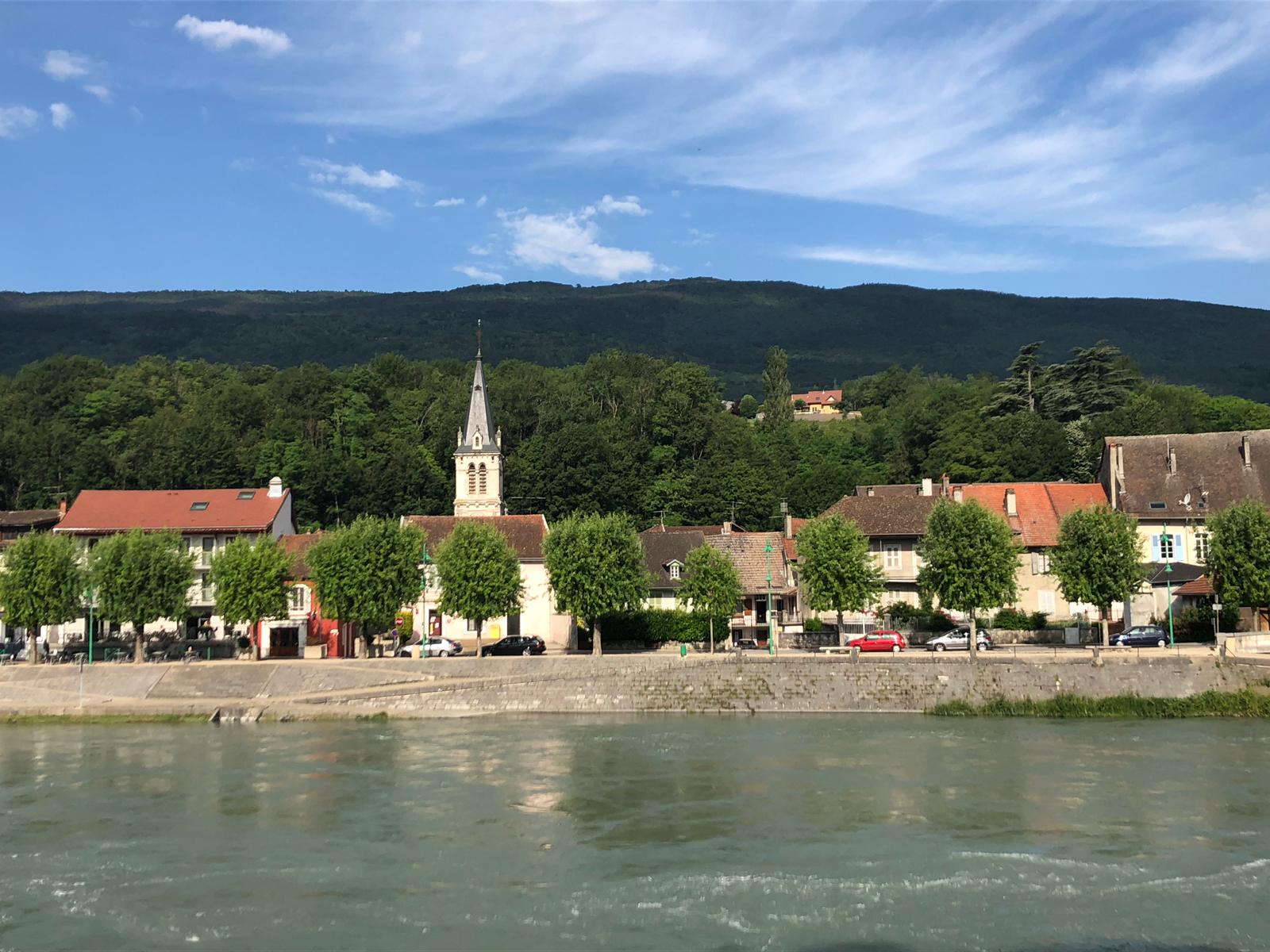 We had planned to stay in Geneva but lack of reasonably priced accomodation meant we had decided to go to Seysell for 2 nights and then cycle back towards Geneva so we hadn’t missed that part of the Rhone.The train connection in Geneva was very tight and then we lost half an hour with the train being late. We missed the french train(platforms7&8) to Seyssel by 2 minutes so had to walk back through french customs. Luckily Geneva station does take euros aswell so at least we could enjoy lunch waiting 2 hours for the next train.I was fairly relaxed after our 4 hour train ride so happy to settle down with a book and a proper chai latte,yes!.By the way on french trains the bikes don’t need tickets and the one we took was very easy to get onto.However people with heavy massive luggage also make a beeline for the bike carriage and are then surprised when there are actually bikes in there.Seyssel is a quaint French town straddling both banks of the Rhone with a relaxed holiday feel,easy to walk around.