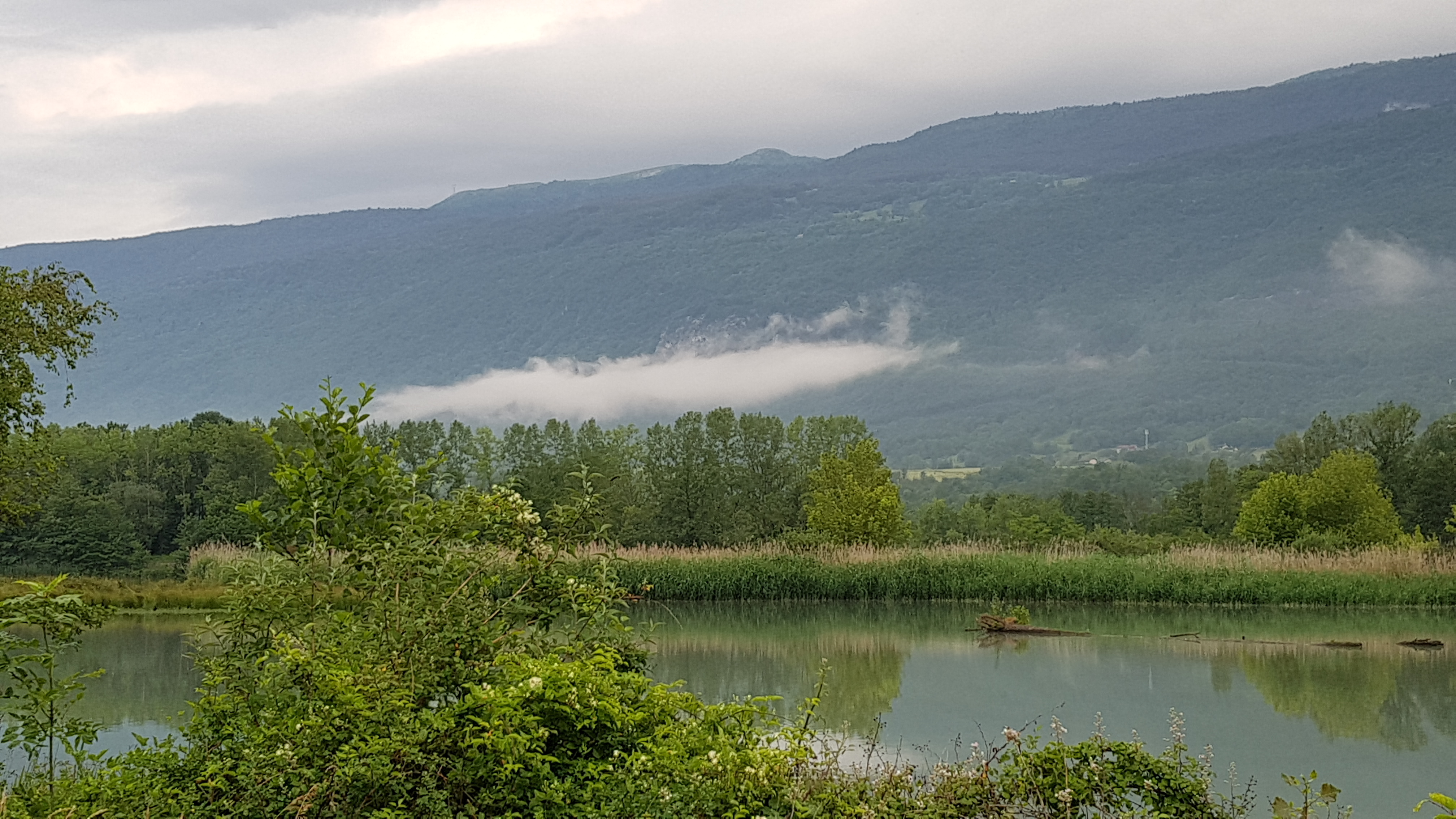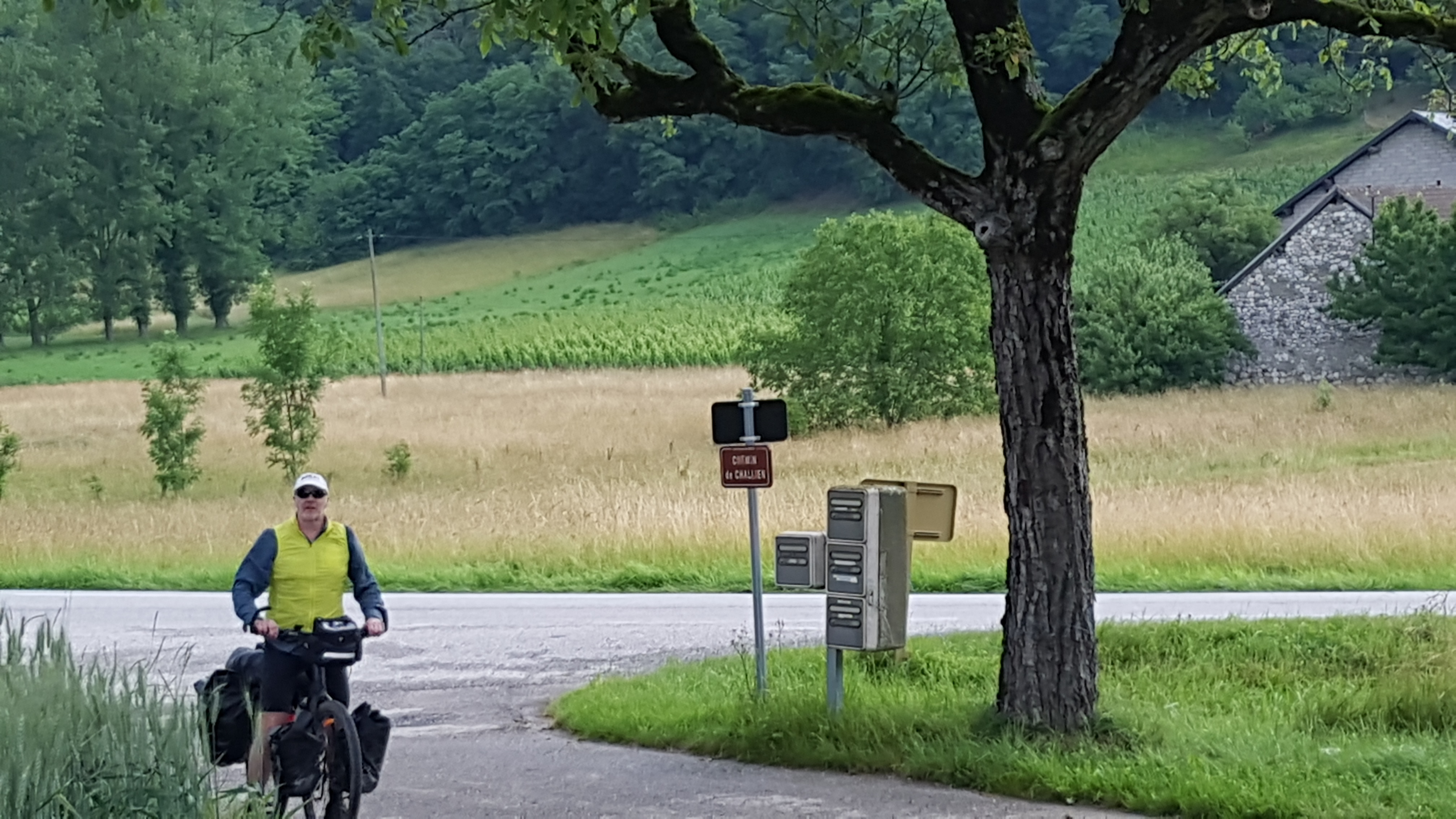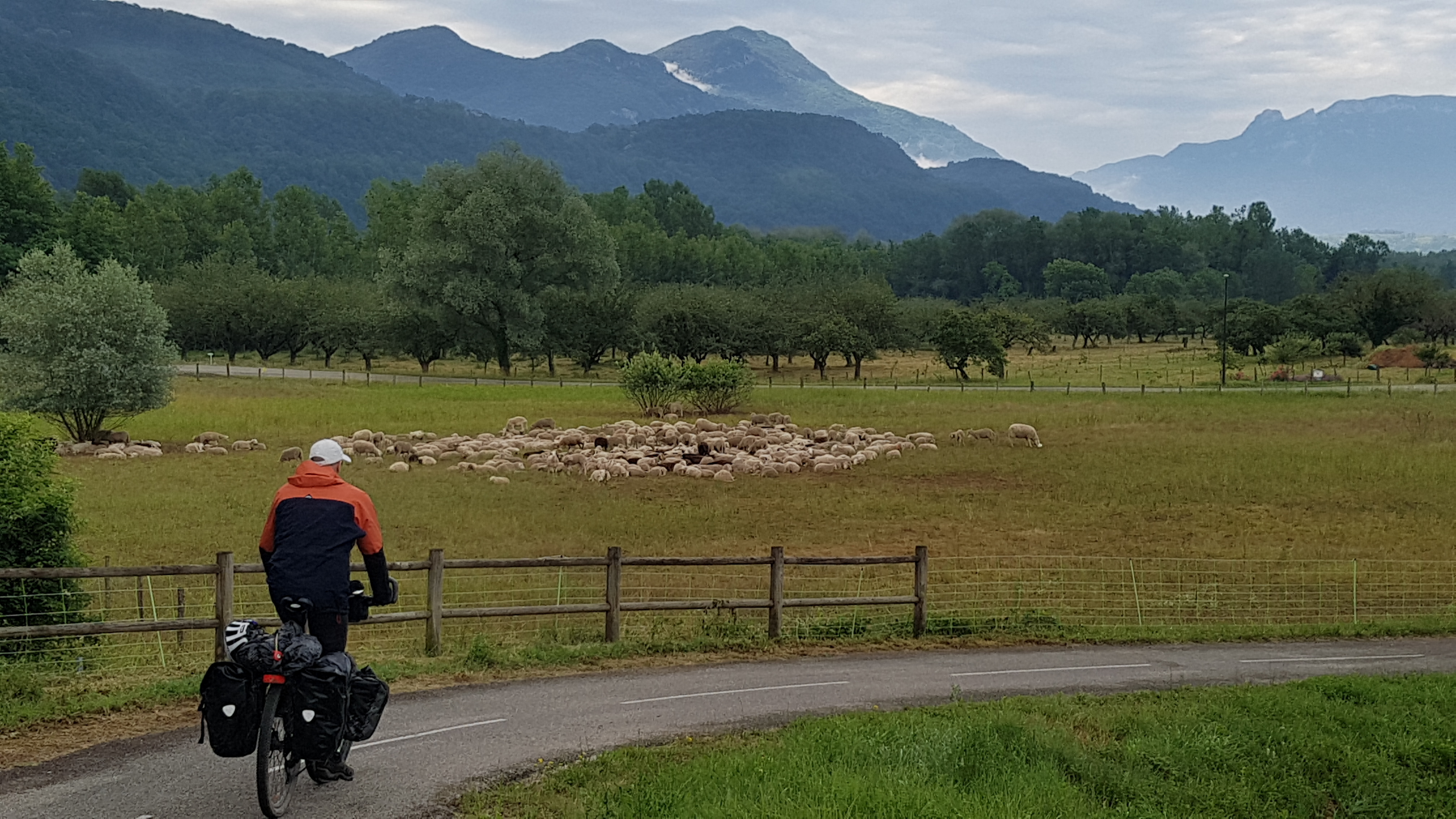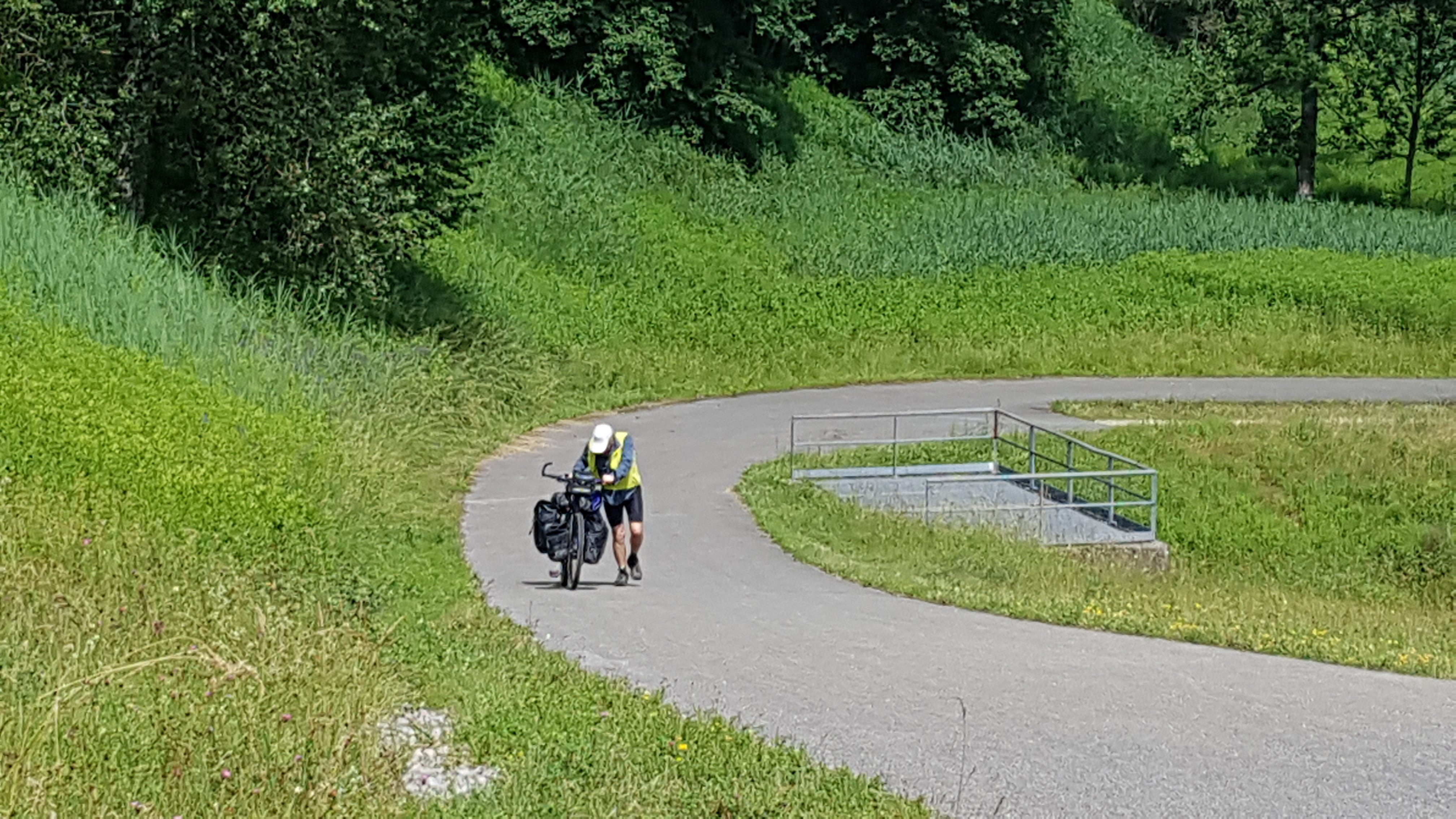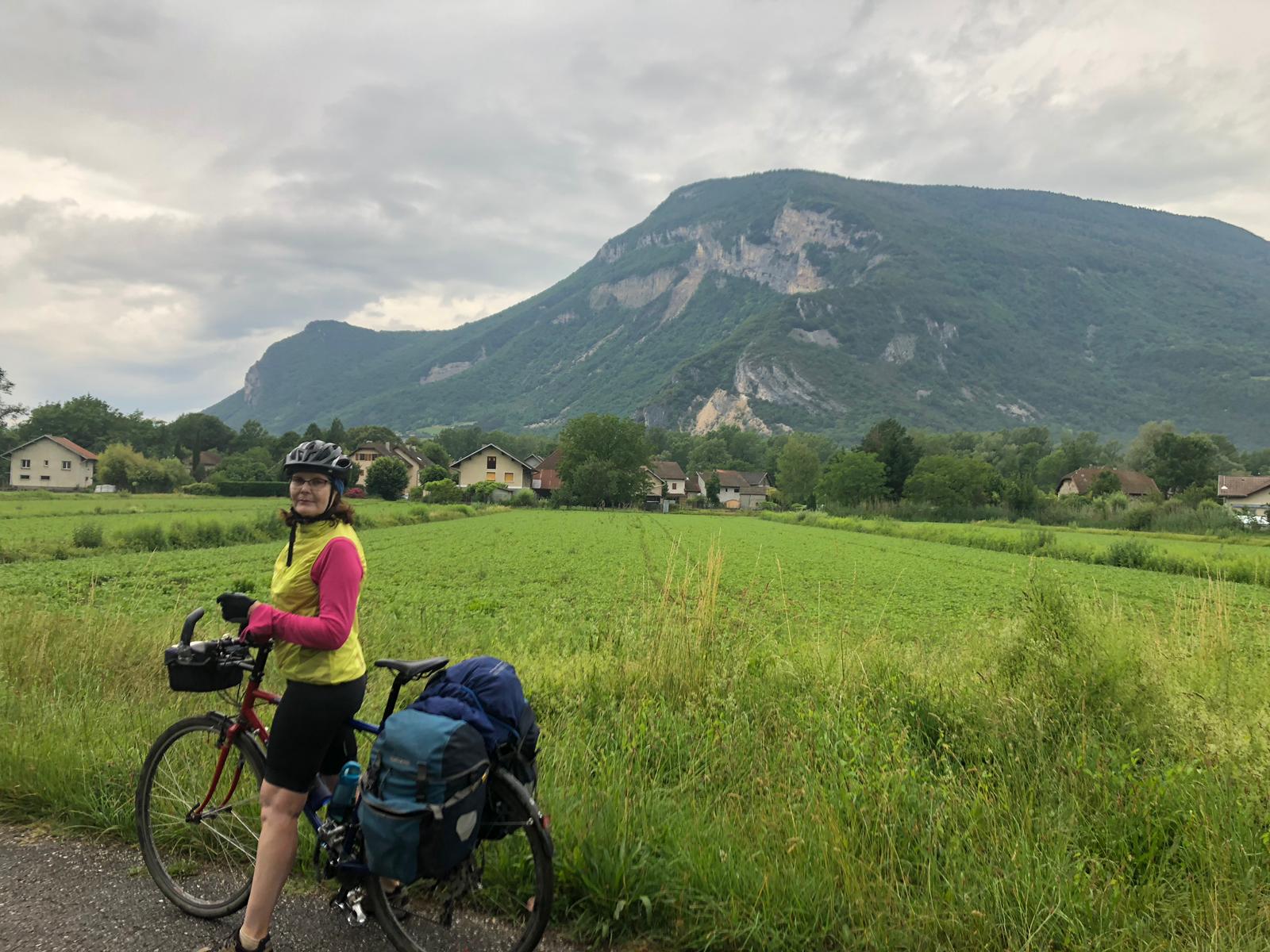 We woke to thunder in fact it had apparently thundered all night I hadn’t heard a thing.We were aiming for an early start from Seysell to allow for raincoats on/off and to give us time to adjust to peddling with our laden bikes again.So we were on our way by 720am, a very scenic start with mist above the water and low clouds on the hills. After 5 kms on a beautiful bike path we were on the road with a very narrow cycle path, negotiating hairpin bends uphills with trucks roaring past. Fortunately tnis didnt last too long before we were off again on country lanes or cycle paths. The threatened rain couldnt hold off any longer and gentle rain started before a short lived full on deluge.At this point my rear tyre decided to have a puncture its magical goo which is meant to seal any hole was just pouring out.I applied pressure to the tyre to try and encourage it to seal/heal!Hubby pumped away and we decided to try and continue cycling.