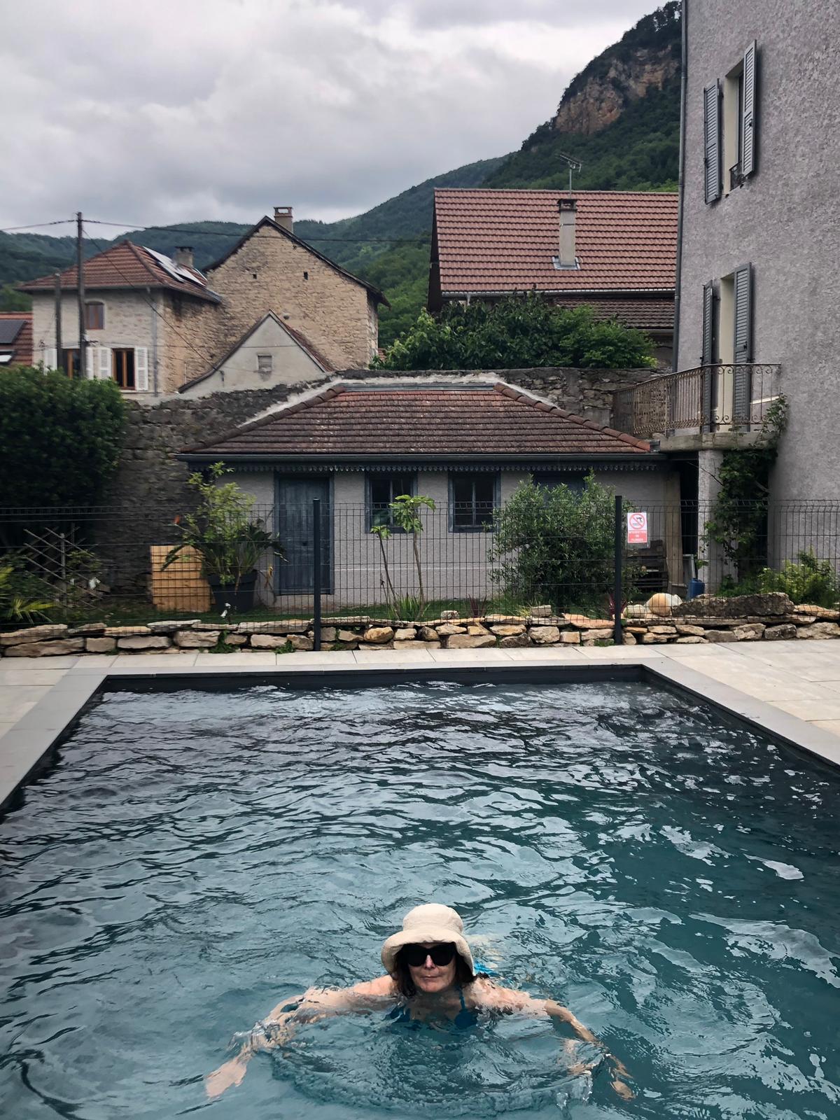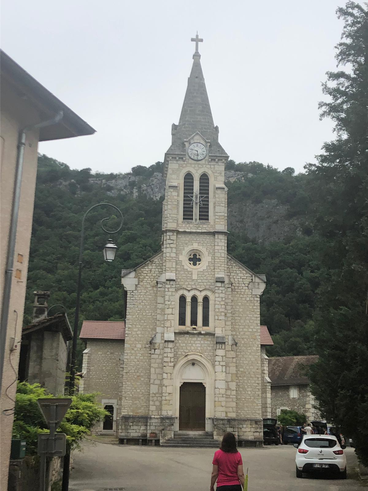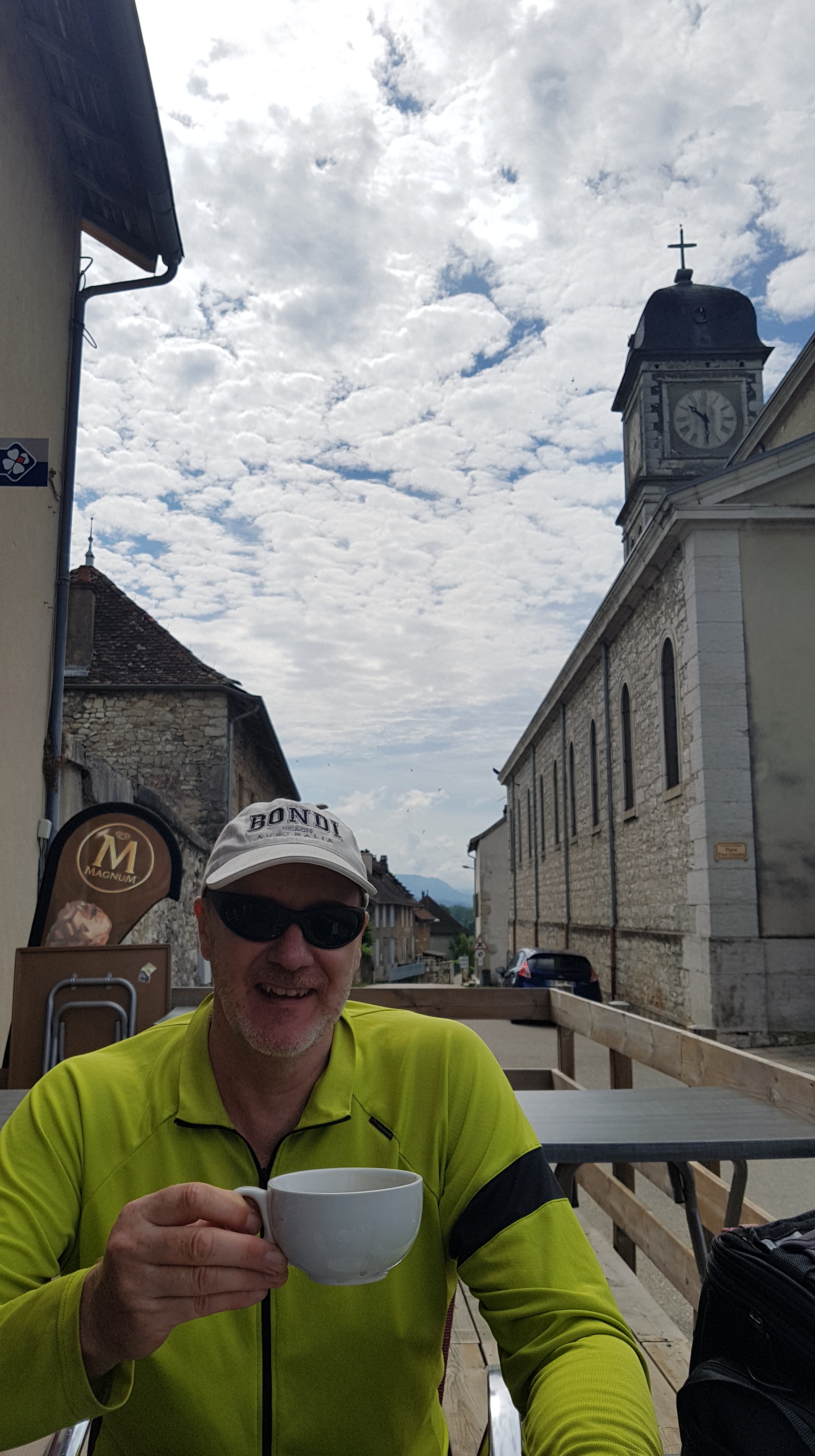It looked like lunch was going to evade us but we had learnt we need to detour to find coffee so for lunch we turned off to Murs et Geligneux and found a great restaurant offering the menu of tne day. It was excellent the entre buffet consisted of snails, prawns and salads. Hubby always forgets the snails at these lunch buffets are rarely enfused with garlic so I always end up eating his chewy snails.One and a half hours later it was back on our bikes to find our airbnb.We found ourselves in a tiny converted barn for the night in Bregnier Cordon.We had only been there about an hour when there was a basket of fruit and tarts arrived for afternoon tea I wished I hadnt eaten so much lunch! Eventually the local dog population settled down but the church bell only 20metres away kept going the whole night and 2 sets of dongs for every hour! We survived the night without knocking ourselves out on a roof beam or falling down the steep stairs when going to the toilet which was downstairs