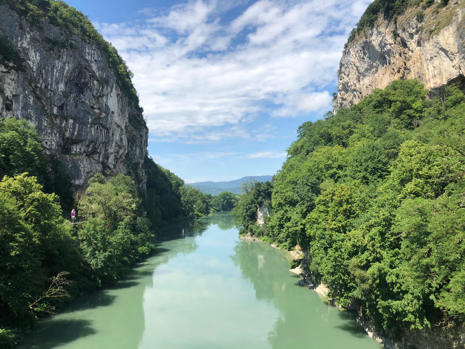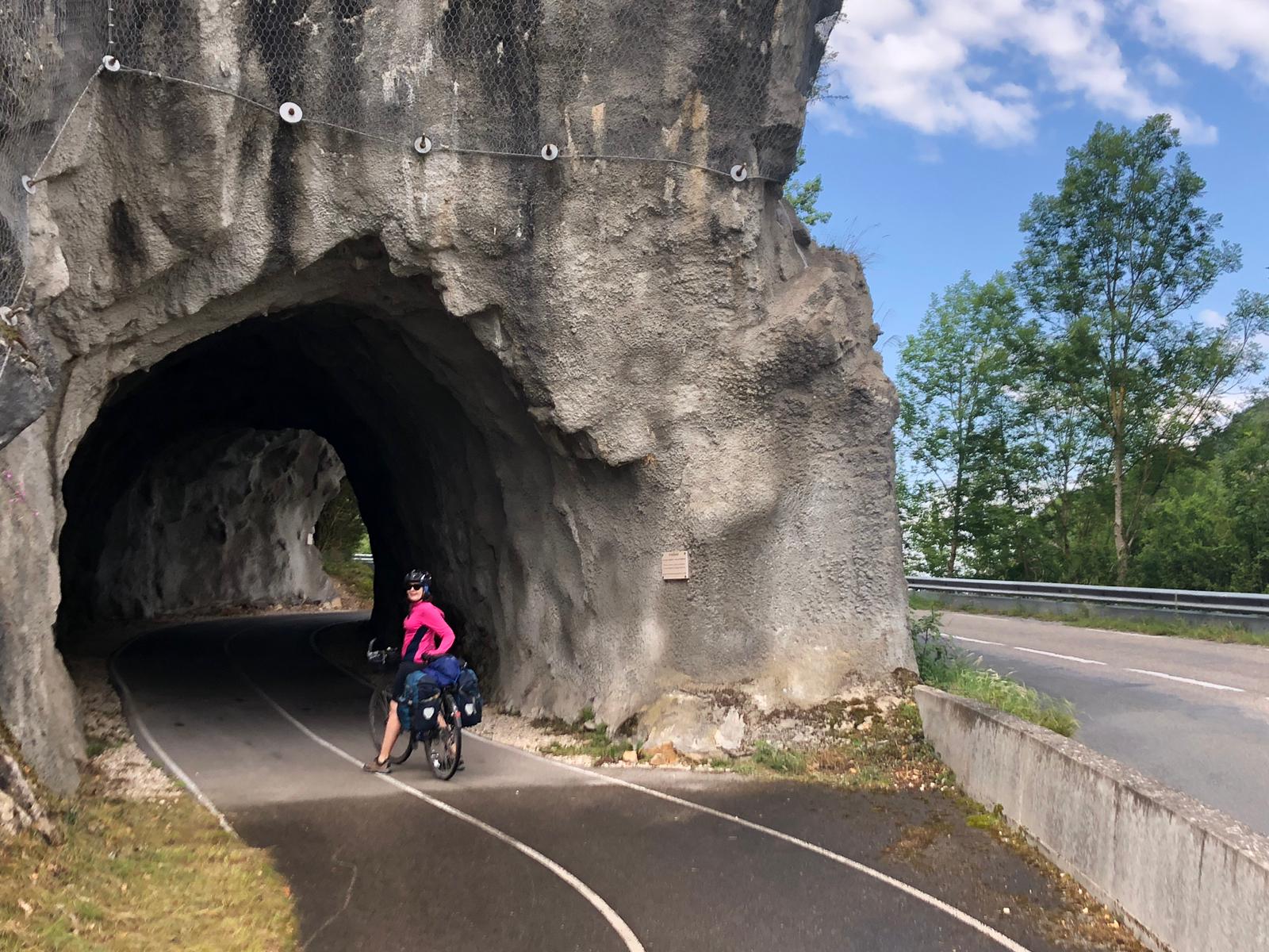 It was getting near lunchtime when I noticed on the map “bridge to be completed by summer 2019.” As we neared the spot with signs up and trucks it was obvious the bridge wasnot going to have been built, ever hopeful I said to the workmen but its meant to be finished by June, ” ha,ha he said but this is France” . I should have added its the same in Australia, nothing gets completed on time.This meant an 8km detour up the valley to cross the riverAin, a tributary of the Rhone. Luckily the up was only 5% do able for us without too much sweating, but we were also going through tunnels with cars. Lights were put on but the tunnels weren’t too long, stunning scenery so we were glad not to have missed tne diversion. Even the bike paths up there have their own little tunnels. We headed back eventually reunited with the Rhone.