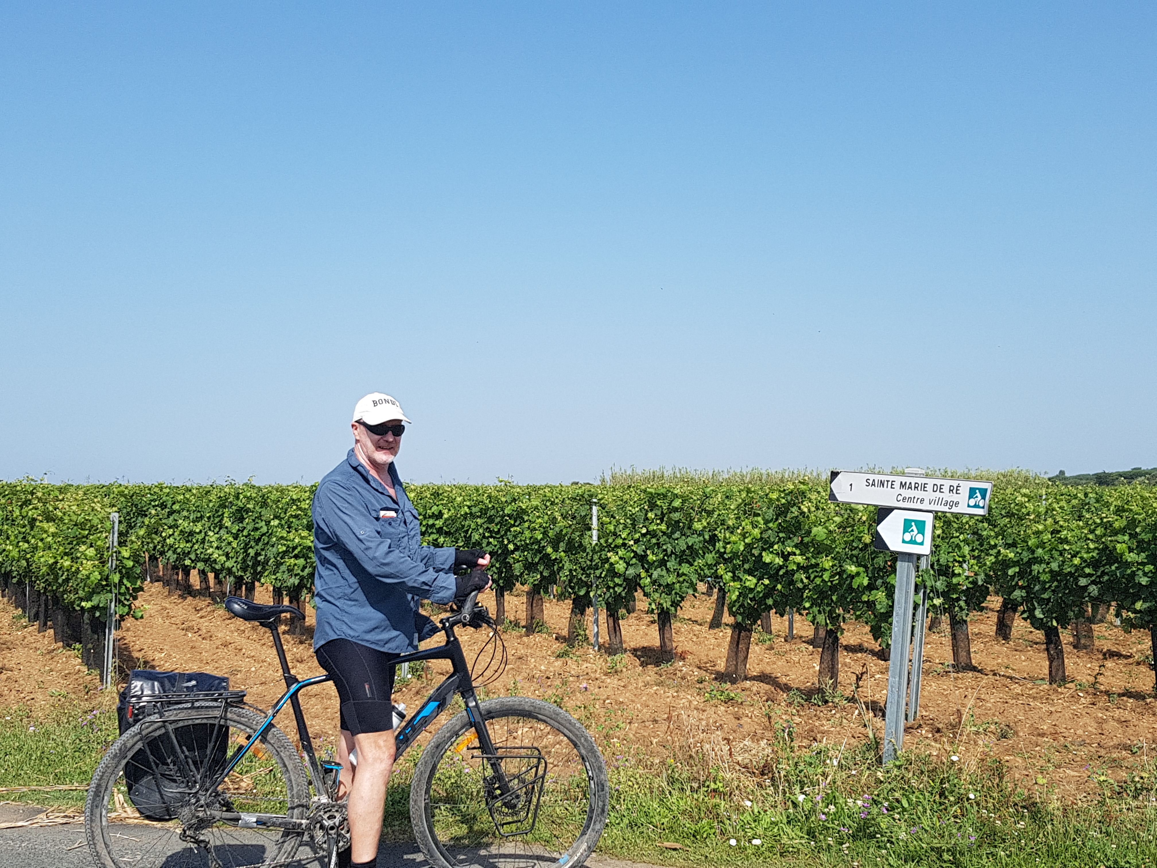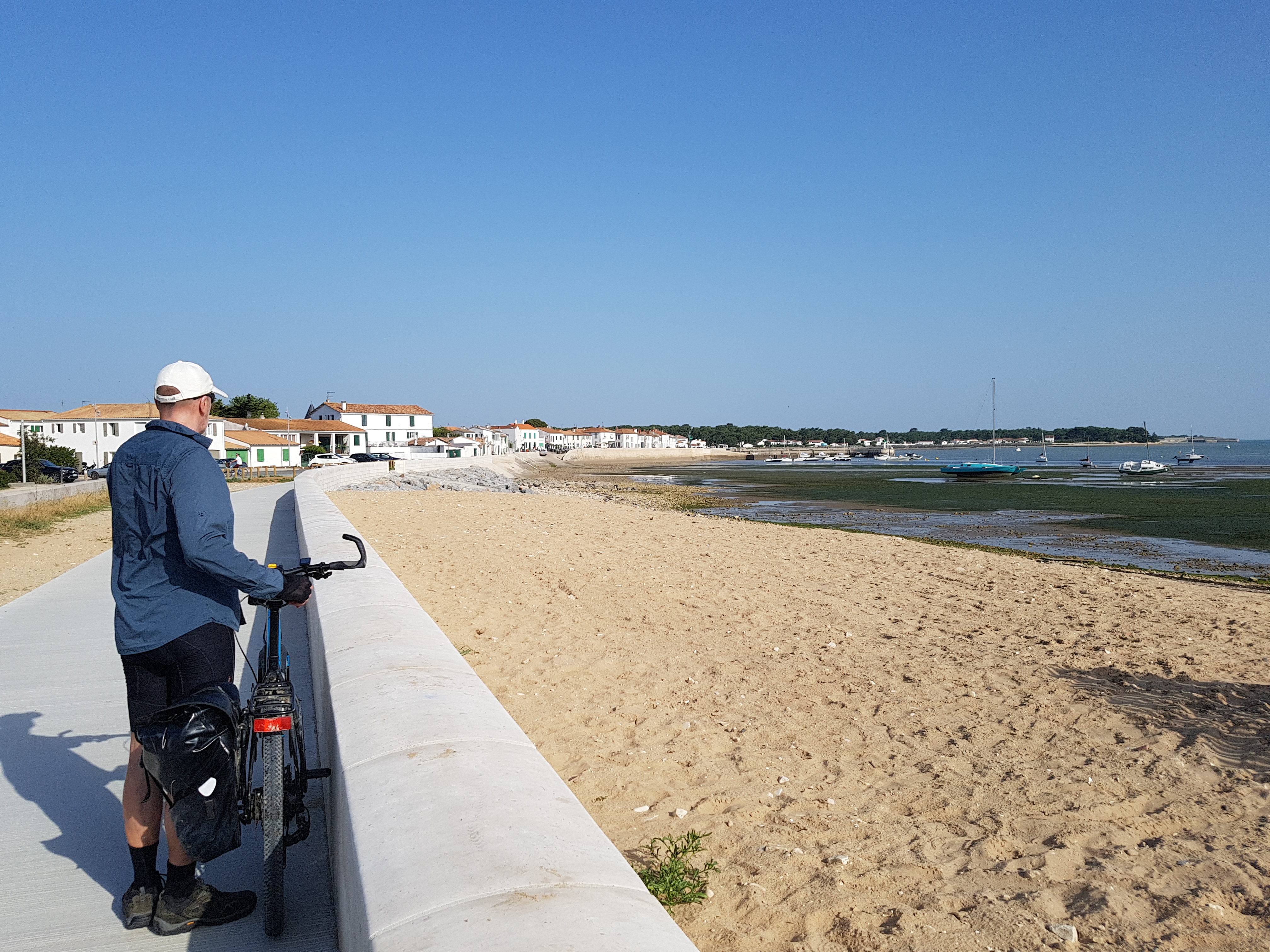 We did cycle down the beach last night to cool off but forget about things like tides, so had to paddle a long way out before sitting down in the shallows to get wet. Today we were organised and set off cycling by 8am for the island off the coast Ile de Re. It was just a short trip 40kms so we could be back by lunchtime and get out the heat. An amazing 3km bridge to get onto the island, curving up and then down across the sea with the cycle path well sepated from traffic.