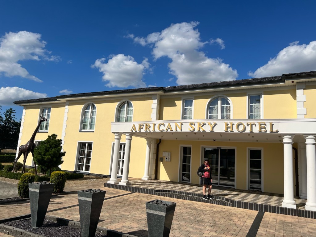 Tim and I arrived at The AfricanSky Hotel at 240pm 20 mins before cut off time. An impressive hotel full of statues of animals in the gardens. The hotel seems really quiet like a ghost hotel, hardly a person anywhere.Reception closed , front doors of hotel closed by 4pm, very strange. Still its a lovely place, we are not complaining and we will be sleeping well after our 79kms today, the bum butter will be getting good use on those calloused regions tonight.!