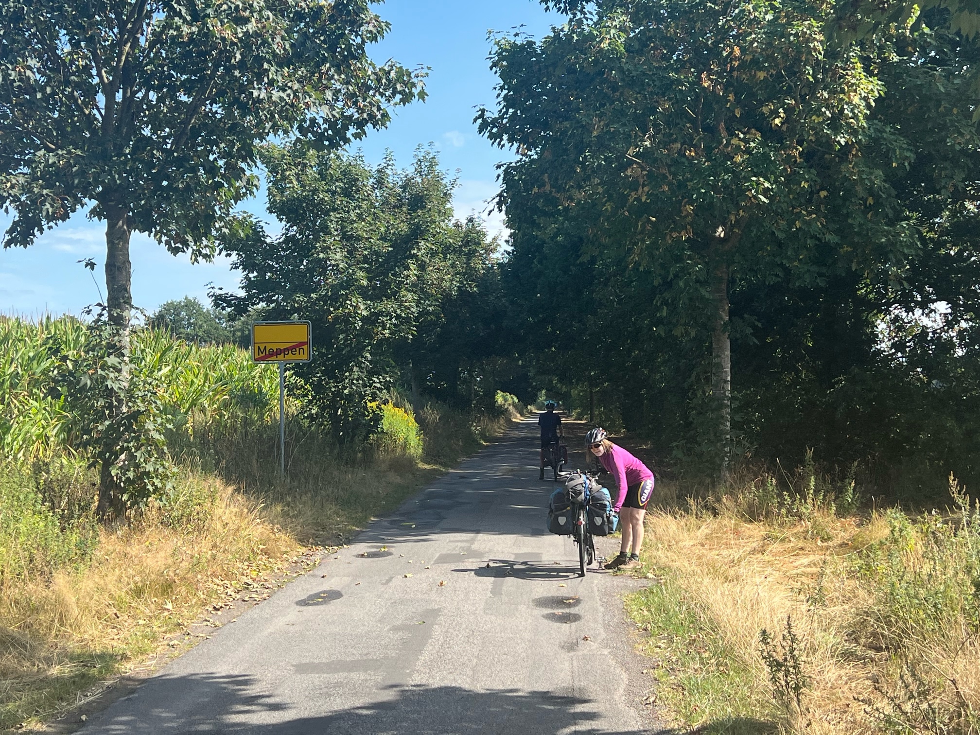 The next hurdle of the day was Coevordens market day fortunately it wasnt too frenetic as it didnt open till 10am. So that didnt delay us too much.Coffee was at Meppen but the boys were on a mission I hardly had time to drink my tea and they were ready to go.Meppen was our first german town. There was no stop at the border although the cyclepaths deteriorated significantly so we knew we had crossed the border plus the huge signs in german about this weekend being a hunting weekend.Great we are cycling through the forests at the weekend!