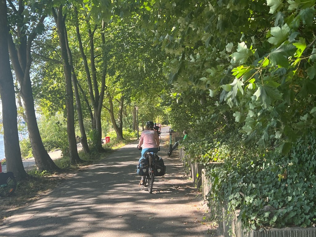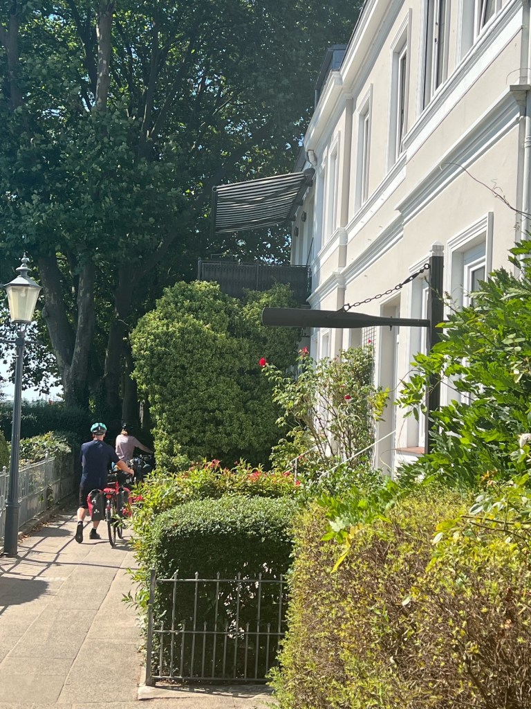 Luckily Tim was with it so he navigated us out I would have gone the wrong way.We stopped at a cafe for drinks and then had the lovely ride out of Hamburg along the Elbe. One beautiful section full of cottages with shutters was pedestrian only so we ended up pushing our bikes for about 2 kms apparently these were all once fishermens cottages in the suburb of Blankenese.We passed beaches with people swimming opposite container ships. The path varied from cobbles to compacted sand, but fortunately well shaded. At last we reached Wedel the first town of our Oxen Trail and to our very friendly hotel, Hotel Diament.