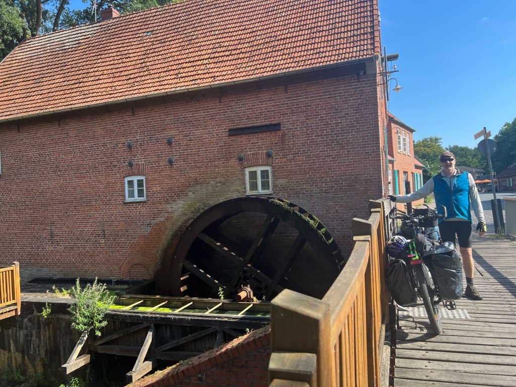 Today was a really good day in spite of Tim putting his panniers on backwards and mislaying multiple things before we set off. It seemed that all roads lead to Bremen at one point we were on a Pilgrims route and when we did go wrong we still could do a few left and right turns and still be heading to Bremen. Morning tea was at an amazing water wheel set up for Benedictine monastry in 1200 to grind wheat, it has been replaced many times since then but is still operational at this lovely place called Heiligeronde.The bakery did great milk coffees, a big mug of tea for me and somehow Tim and Mick managed to slip in an order for an apple strudel each.It was an interesting ride including stretches on cobbled roads, my teeth havent fallen out just yet, how do the tour de france riders do it.?A lot of shady stretches luckily as it is warming up again another reason to head north. It was a beautiful ride into Bremen although at one point the signposts did completely disappear but very quickly we were being directed on by friendly locals.Tim and I took our time as we entered Bremen and then found all these market stalls selling food. It was so well organised and no throw away plates and cutlery, you just returned them to be washed up. I couldnt resist a big bowl of split pea soup, I know a bit warm for soup but it smelt really good. Amazing value 4euros including bread.