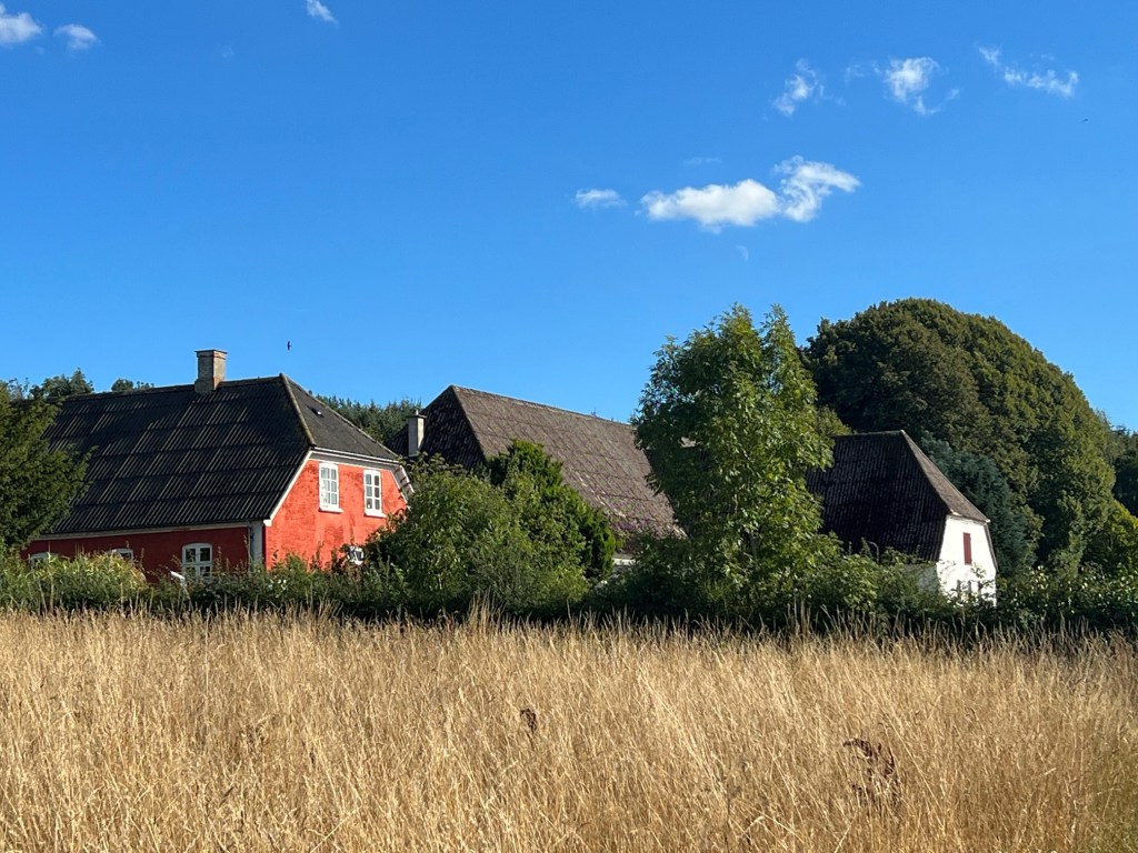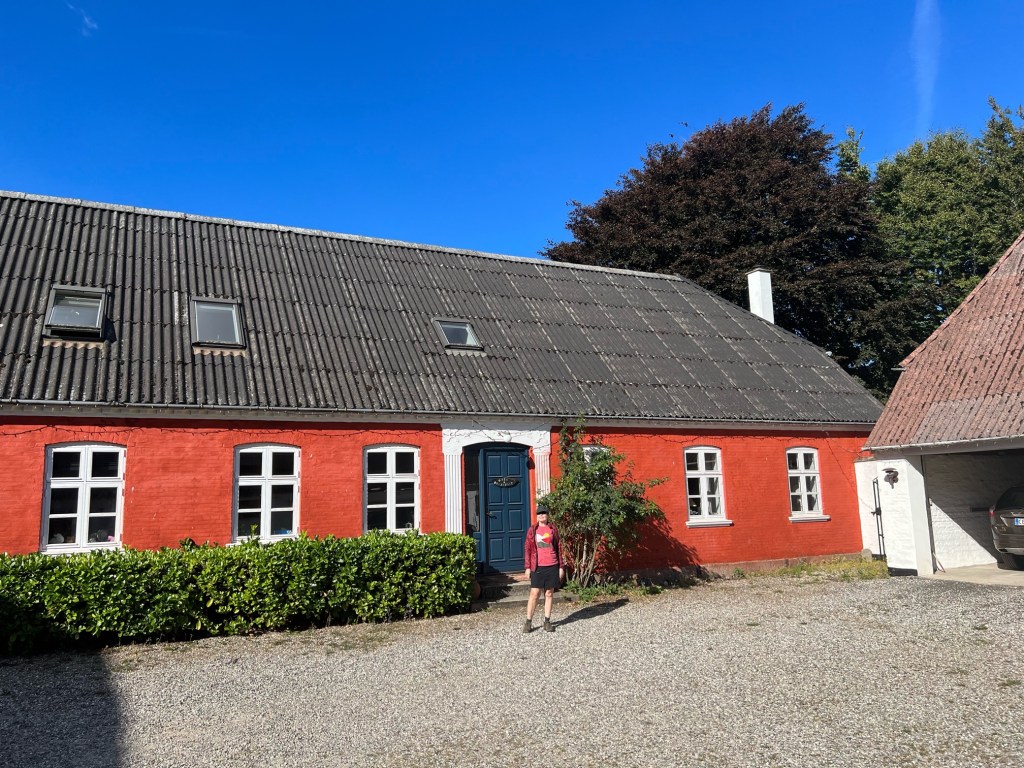 We cycled on into Assens and headed to the tourist bureau , no Assens only had one hotel and it was always full and weekends the other 3 bed and breakfasts were also full.I knew the youth hostel was full aswell.She said the bed and breakfast we had booked was only 7kms away I think she forgot we were on bicycles bike paths are always longer.We had a quick cuppa at the cafe the local cinema yes they know how to make coffee and tea , we’ve got it sussed.Then it was back up hill and dale for 10kms till we reached our very traditional farmhouse.We had picked up supplies for dinner in Assens so finally relax time in our huge appartment in the roof of the farmhouse almost traditional dutch style with our bedroom full of beds for children.The owner had sold off the farm about 10 years ago.We asked him about pig farms and why we had seen horses,cows and sheep but none of the famous denmark pigs running around fields.It turns out those long barnlike buildings I’d seen with wide chimneys weren’t smoking houses for fish but pig farms.The chimneys allowed the release of all the gases the pigs produced, he did say they were very regulated now so no overcrowding of pigs etc but still not so nice for the pigs.