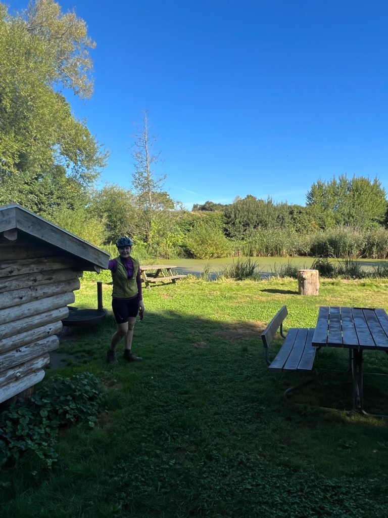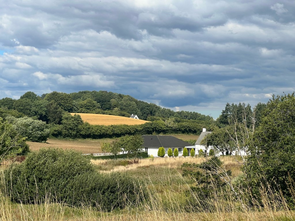 We were thinking where to stop for morning tea when we came across one of the Danish wooden shelters.It had 3 benches and tables, firepit, wood stacked up, a tap for water plus a long drop toilet.This one you had to scan a QR card and pay 10krona each to sleep tbere.A bargain except we dont have sleeping bags or thermarest mattresses with us.Anyway a lovely place to stop, the lake next to it was looking a bit green with the lack of rain so I suspect you’d need a mossie net aswell.Opportune stop to refill our water bottles aswell as there are few other places to do so and climbing those hills was warm work.