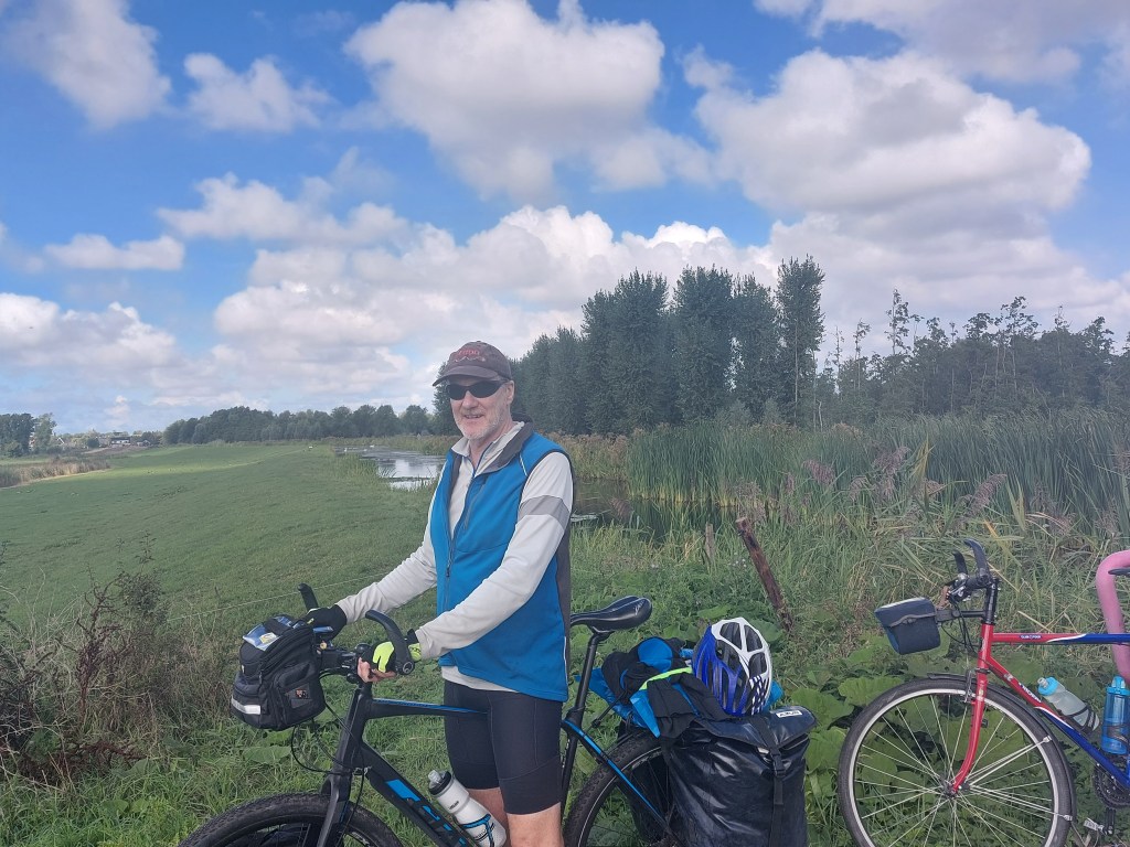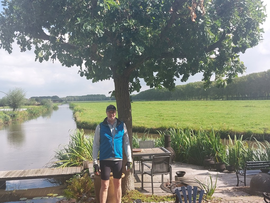 We left our bed and breakfast after sleeping in till 7am unheard of but we were off early as the long anticipated rain was due to arrive at least 20mm of it.We had slept with the big windows wide open in spite of the rain as the house had a musty smell to it.Tim did open the window in the breakfast foom aswell which wasnt appreciated by our host,Eric.Eric then said he was trying to fix a rising damp problem as the bricks absorb water and he needs to piut a new damp proof course in but the bed and breakfast had been too booked up! So that was the musty smell good job we had all the windows open.A scenic ride out along canals past windmills however a significant diversion delayed our progress. The sky in the distance was turning menancingly dark.We donned rain gear but then we were peddling through puddles the rain had been and gone to this area.Rain gear off.We diverted into the town of Zoutermeer for a coffee break.