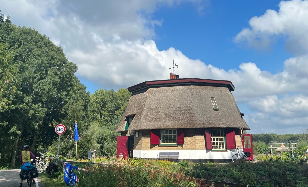 We headed off into the green route seeing as rain wasn’t forthcoming and came across an old watermill.It was open to the general public for national monument day.A very cute round house the water wheel which used to maintain water levels in the fields was no longer there but where it had been was huge.Pumping stations (run at times on green electrical energy ) now keep the water levels constant out of the low lying lands-polders, independent water boards have managed the Netherlands water since the 11th century.We cycled past green energy production -fields full of solar panels plus wind turbines.