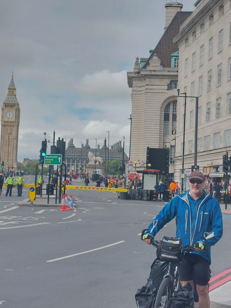 Liverpool Street station didnt seem too busy and as we cycled off down past Bank and down Threadneedle lane all seemed quite quiet.We reached supercycle highway 8 along the Thames hardly a cyclist in sight fantastic. We soon found out why as we got closer to Westminster the cycle route was closed!We were directed back over Westminster bridge, helicopters were overhead, the Thames was lined with photographers and crowds were building.No chance of staying with our bikes and panniers in the crowds it would have been impossible.