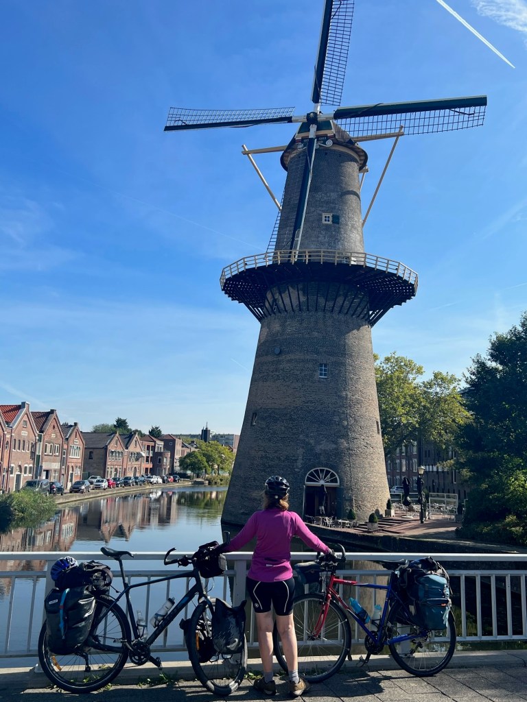 We left Delft along beautiful canals, past many windmills finally cycling along the maas river into the Hook of Holland.Morning tea was at Schiedamm, at an ice cream shop who did a really good tea and coffee and instead of a small biscuit we got a teeny weeny icecream.Everything was closed as it was Monday apart from a bike shop.We dropped in to get a new bike lock as one had given up the ghost.He tried to sell us a really heavy one saying bike theft is huge in the Netherlands as I could hardly pick it up there was no way it was going in my panniers.We settled on a more lightweight version.