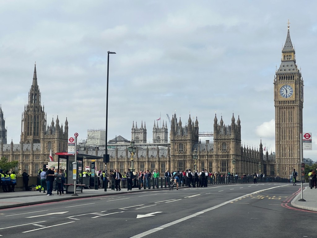 We spent the night at Harwich and weren’t meant to catch a train till 931am but we kept hearing that the trains into London would be packed so we set off earlier.Our bikes had had a treat ascwe were told to store them in our bedroom with us! We had to change trains at Manningtree and one train to London arrived and the stationmaster said this train is full wait for the next one.We asked about our bike reservation and he said just get on whatever train you can as everyone is heading to London to see the queens coffin move from Buckingham Palace to Westminster or to queue to pay their respects at the queens coffin.We got on the next train ok but in the wrong carriage, the bike carriage was the next one.So we had to jump off and rush to the next carriage, we just made it.