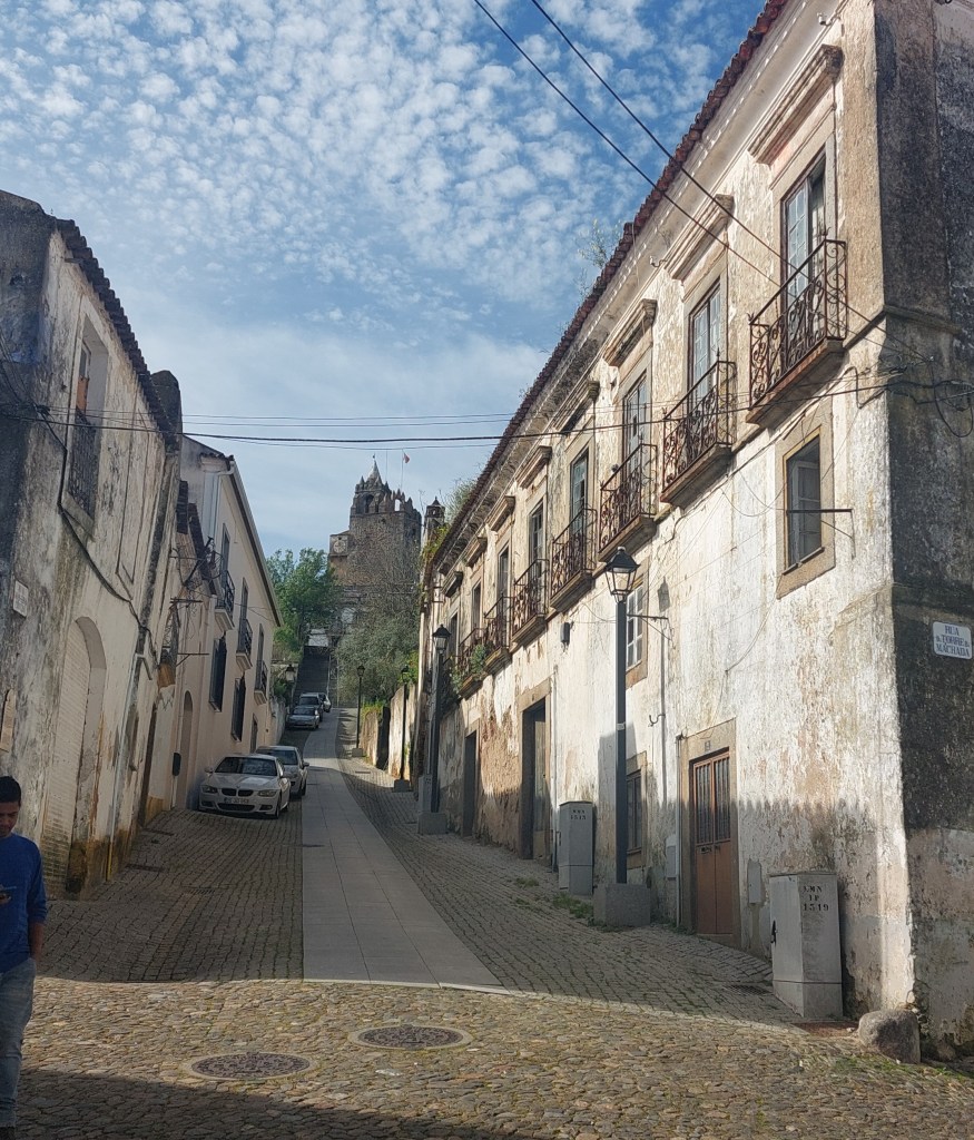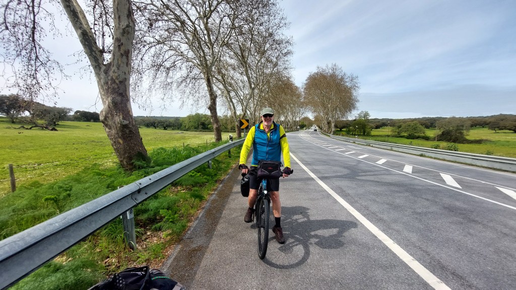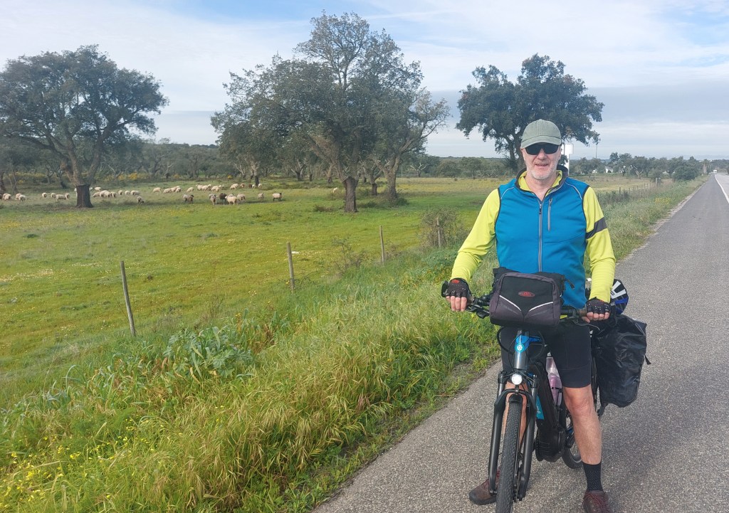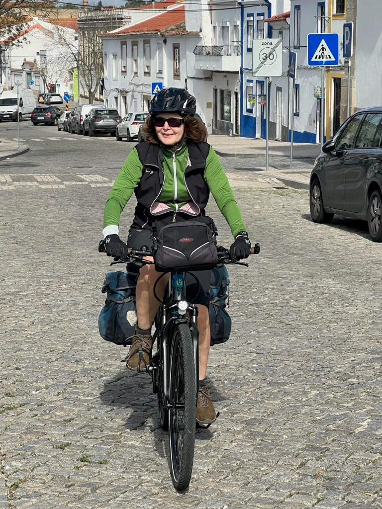 After a cuppa of cha and Tim’s milky coffee, gallio, plus the obligatory Portuguese tart , a bit sweet for me but nice nutmeg flavour,we were on our way again. It was easy riding as we had a huge lane next to the road and the road was direct to Evora so only navigation was to get out of Montemor-o-Nova tricky with tiny roads and alleys and into Evora inside the walled town.A great cycle path is being built around Evora but its not finished yet. Fortunately I have found a button on the computer of the bike which makes it go whilst you’re holding it in ie. walk mode so my bike will go up and down steps very clever and get me off unfinished bike paths safely.