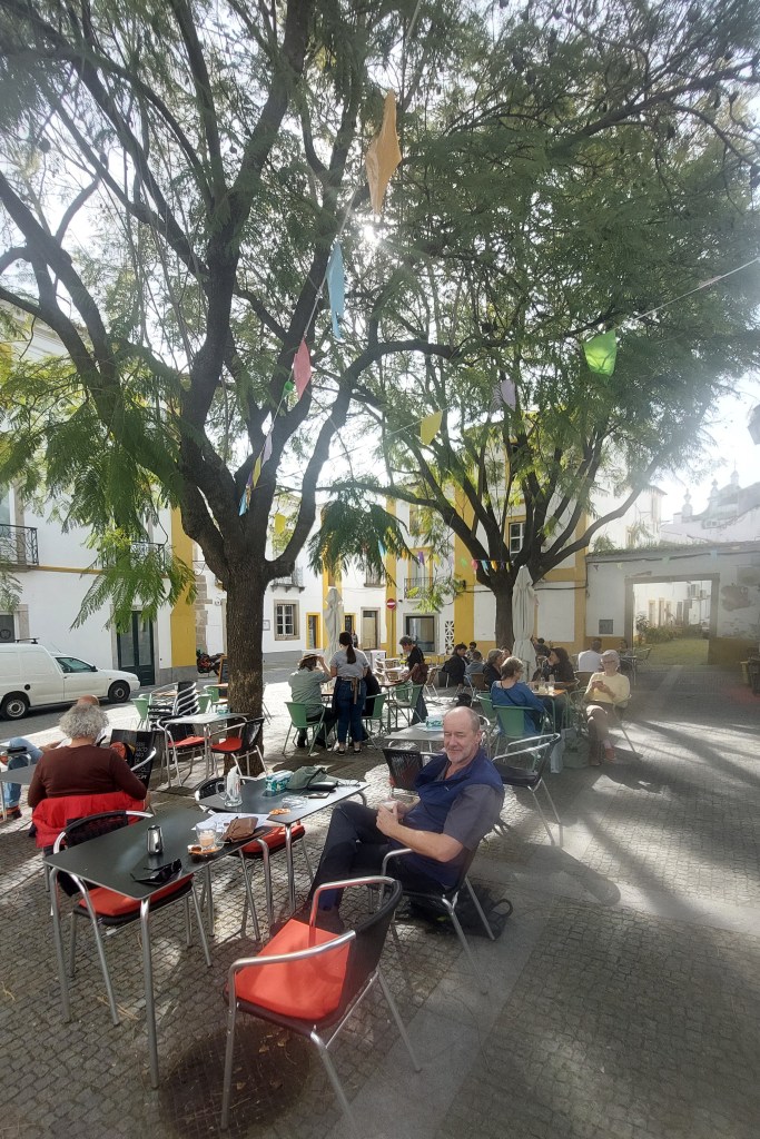 Our coffee stop was in Montemor-o-Nova an old historic town with a castle on its summit.Normally I’ll only pedal along a couple of cobbled streets and give up but on this e-bike I could go anywhere.There was no sign of coffee shops in the old town and we were on way out when I smelt coffee Tim had sailed past unusual as he has a better sense of smell.He was called back and we went into a great patisserie advertising the work of a local pastry chef Andre Megaloe.We thought about the Megaloe chocolate but we already had one bar of chocolate on board and the weather is warming up.It also displayed a great chocolate carving from the obidos chocolate festival, very tempting to break a bit off…