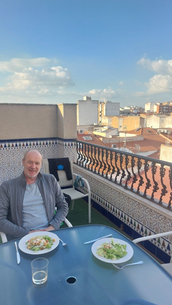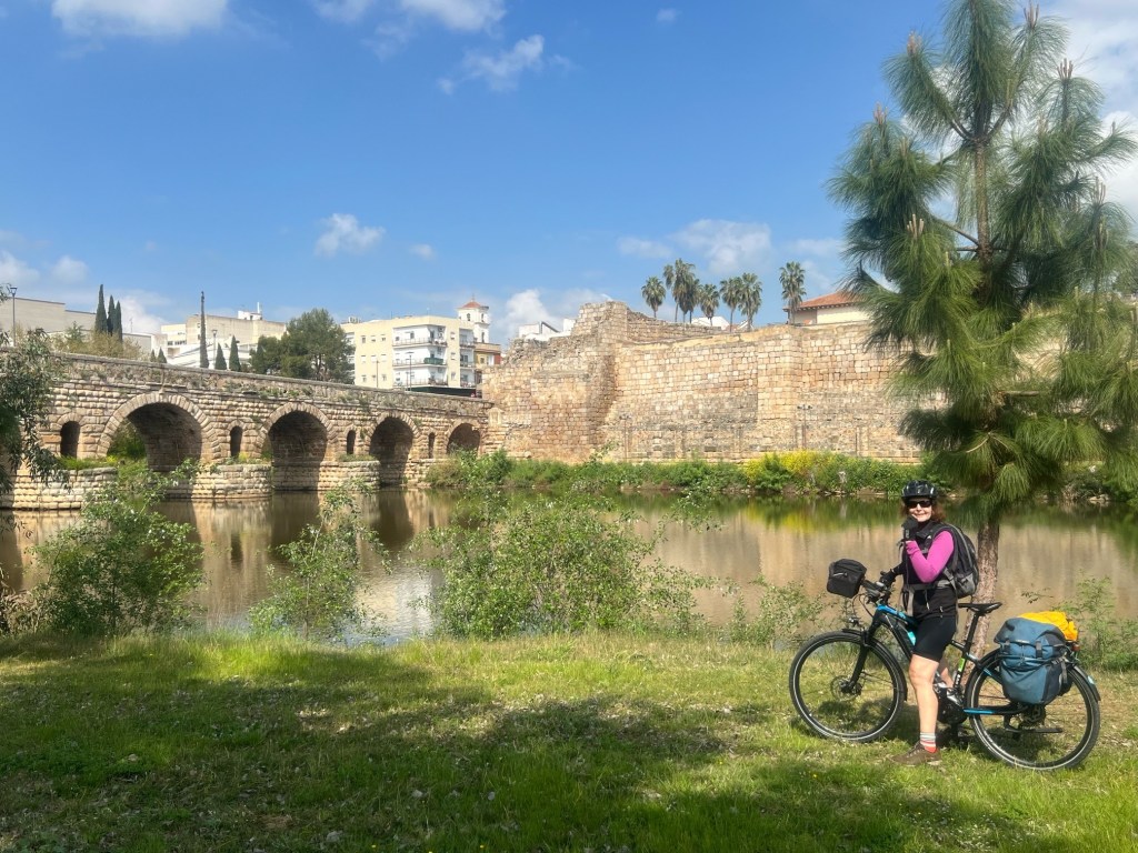 Merida was a delight to cycle into being immediately confronted by remains of Roman aquaduct’s and the beautiful Guadiana River with islands and parks in the middle.We also saw the huge Roman bridge the longest well preserved one in the world and still in use.We had booked an apartment as it seemed the only place that guaranteed a garage for our bikes, hard to find in an old historic city. We cycled close to where we thought the apartment was and settled into a restaurant/bar for lunch.Tim managed to get a decent hamburger and chips but I had ordered off the tapas menu and got 8 postage stamp size pieces of tuna with some avocado puree, still hungry…At this point I checked my phone to see the phone number I had to ring to meet someone at the appartment to let us in. Agghh our booking had been cancelled our card hadn’t gone through and they had messaged saying pay by 12 or your booking will be cancelled! I phoned using our local sim card but they didn’t speak any language except Spanish, luckily a lady on the next table offered to help. She talked to them, gave a credit card number but as we had an Australian what’s app and not Spanish we now had to collect the key from a hostel supposedly 5 mins away. We thanked the lady and Tim paid for her drink.This 5mins away turned out to be a 15 mins bike ride , fortunately along the cycle paths on the islands so quite pretty but we had already cycled 70kms!