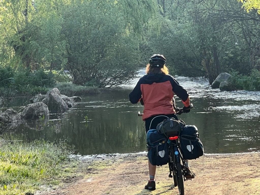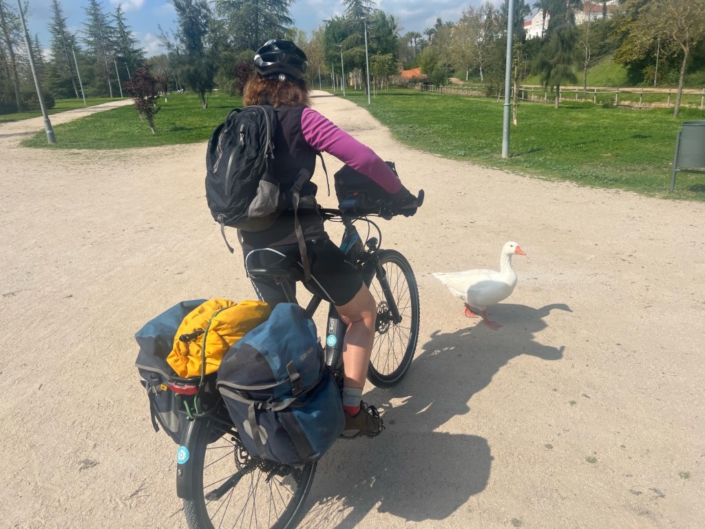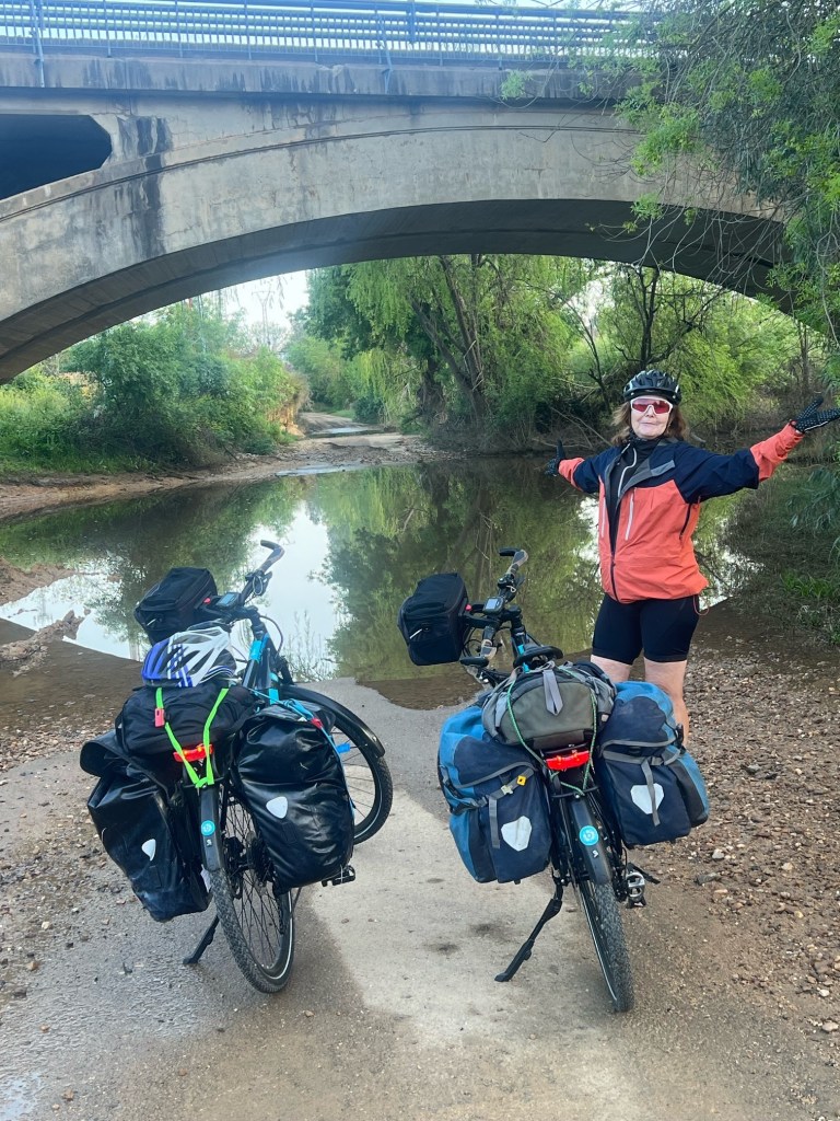 Tim didn’t sleep well in the Kremlin style hotel but their underground garage was pretty good for the bikes so that was the plus side. We were waiting at the door for breakfast at 7am almost ready to go and in need of breakfast after our sparse dinner.Tim had downloaded our route out of Badejoz on his map out app on his phone, it had lead us into a few difficulties not recognising things like one way streets but all looked good as we cycled out of Badejoz , even on a proper cycle path next to the road.This went well till we had to cross the road and our route disappeared into a bumpy lane, the road we were cycling next to had now turned into a motorway ,no bicycles!We continued down the bumpy lane even when we kept seeing warning signs and no cycling signs Tim reassured me its just a bit further after the river then we will be on the main route going east.Well we got to the river, no bridge, just what looked like a fairly deep river.Even with a normal bike I might not have attempted crossing it.We cycled further down to a walking route maybe a foot bridge , nothing just a wall of water.Tim looked on his phone I activated my roaming , we had to go all the way back and further south to cross the river, kms extra.We turned around and as we cycled next to motorway we saw cyclists on the motorway. We looked at each other, right if Spanish cyclists can cycle along the motorway so could we. We headed on just as we were entering the motorway we met a Spanish cyclist on his own and he indicated we tuck in behind him, I obviously looked terrified.We negotiated the motorway and crossed the river and were back en route.