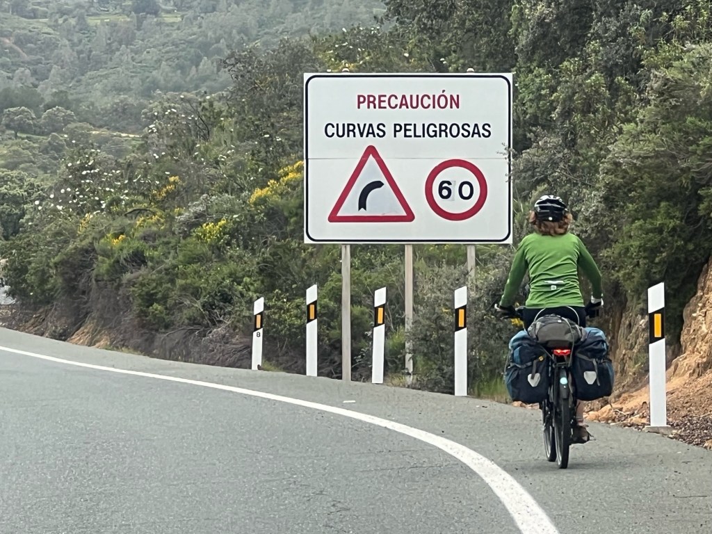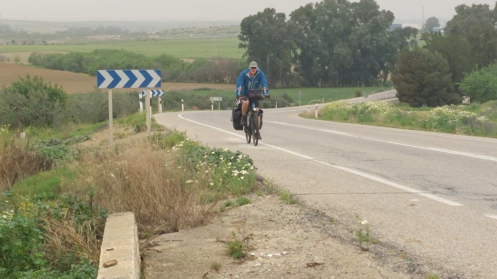 It was a streamlined morning, breakfast at our appartment and bags packed down to the garage ready for our hilly ride.We opened the door to the room where the bikes were stored…..problem Tim’s front tyre was flat. It was wheel off, new tube fitted etc but Tim was rushing as we should have been pedalling so the tyre wasn’t seated that well and Tim had put it on the wrong way round. Yes technology is amazing nowadays your tyres have little arrows down the middle in the direction they want to go.So Tim’s bike has been trying to go backwards all day and has a great wobble downhills as the tyre wasn’t seated that well.We also had to contend with another dusky sky filled with sand from the sahara again, apparently not good for the lungs.I did try my bandanna over my mouth but as I couldn’t breathe that was no help at all.