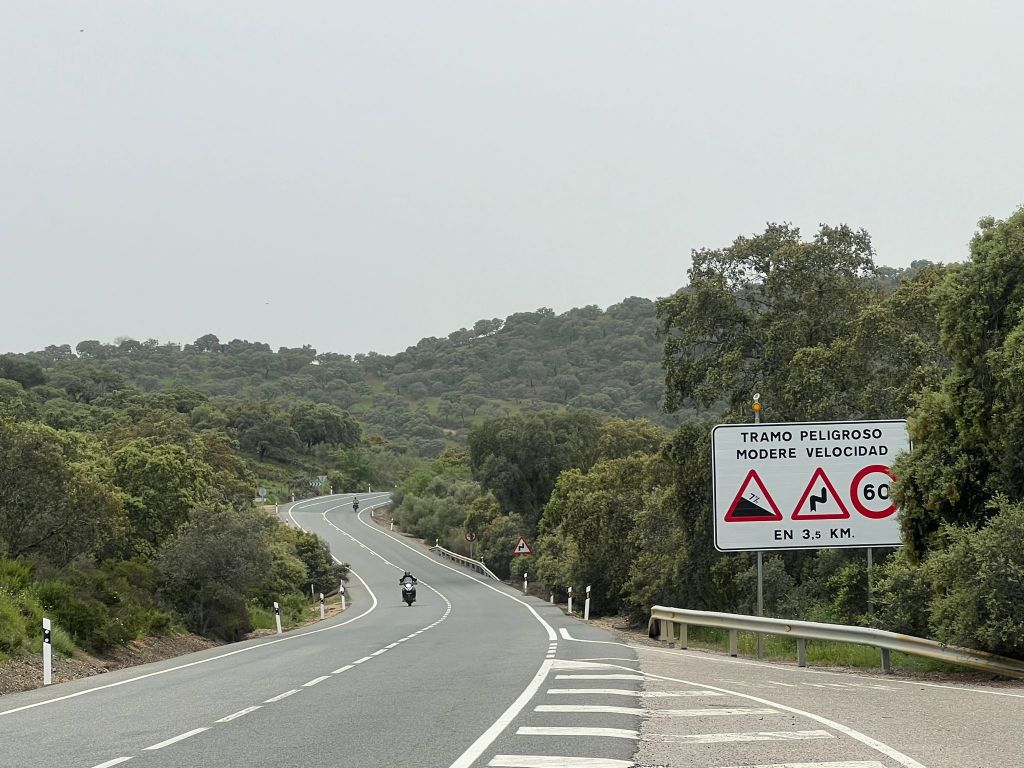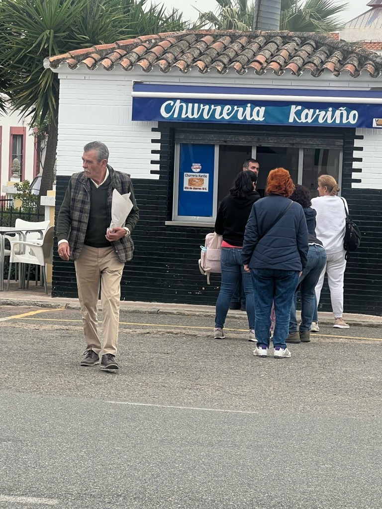 We needed an early coffee after the bicycle tyre fun in the freezing cold garage so we stopped at the first town we came to St Olalla del Cala , 22kms covered very fast downhill mainly, my battery still showed 95% ! Tim went into to get the drinks whilst I watched what was happening across the road.There was one man frantically cooking in a kiosk and putting what looked like donut sausages in a huge paper bag and then onto the next customer. They were all served the same and as fast as people were served more arrived.Yes it was churrizos or churros as they are know in other parts of Spain.Everyone in the bar had a bag from old to young and were dipping them in their chocolate or coffee.We were tempted but it was a huge bag and they didn’t look like they would taste good cold or the next day either.They are meant to have originated from a staple of shepherds apparently. Crispy creme donuts in Australia can attract queues aswell but no cultural significance to them!