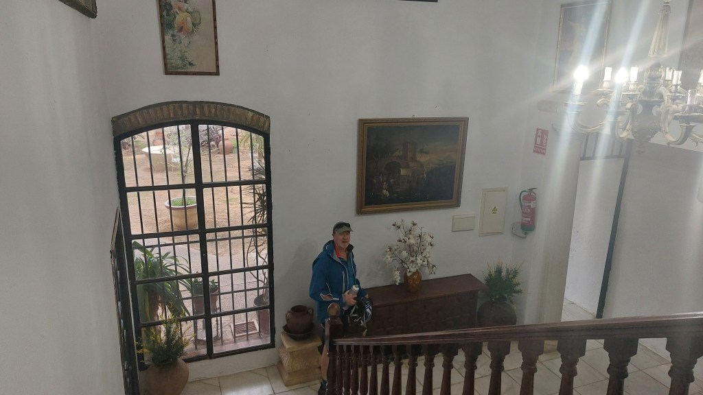 It was a very peaceful night in Alto Hotel they even had those wonderful metal shutters that cocoon you into complete darkness.I would no doubt have continued sleeping till Tim told me it was nearly 7am , unheard of for us Ozzie early risers. Breakfast was a Fawlty towers affair, first we walked into dining room , no, we were then ushered into the bar.So much for thinking we would be helping ourselves to a nice breakfast all laid out. Another couple were looking for breakfast too.They ordered and got coffee so I said to Tim you had better order us some tea, Tim does have some vague remnants of O level Spanish, tea arrived. Meanwhile the other couple (spanish) were eating food, we waited and waited nothing happened.I then said to Tim I think we have to order something.There was no menu so all I could think of was ” dos tostadas por favor”.Anyway we ended up with 2 lumps of bread with very nice cheese and ham on.The ham was freshly carved off one of the bones hanging down in the other side of the bar. I did see the other couple had tomato puree so said “tomat” por favor and then Tim not to be outdone asked for 2 orange juices , narankas which were freshly squeezed, so in the end a good Spanish breakfast.It just took a long time!