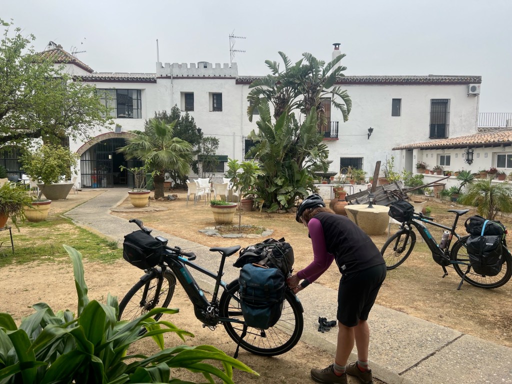 A reasonably easy entrance into Seville guided by other cyclists onto cycle paths, past some great modern architecturally interesting buildings, the Sevilla Tower finished in 2015, towered above us.We found a cafe near to where our appartment was and grabbed a coffee whilst I phoned up the appartments agents to say we were close. No hiccups this time and we met and keys handed over.We are in Triana a walk over a bridge takes us into the old city but here you are surrounded by cafes and unusual shops.A market, Mercado de Triana is full of eateries and fresh fruit,vegetables and patisseries!The appartment block we are in is very Spanish, huge wooden doors lead us into a central courtyard and even better for us there is an underground carport so we have our own space for our e-bikes.This is fortunate as rain is forecast and e-bikes with batteries out should not get wet, or they will not work!