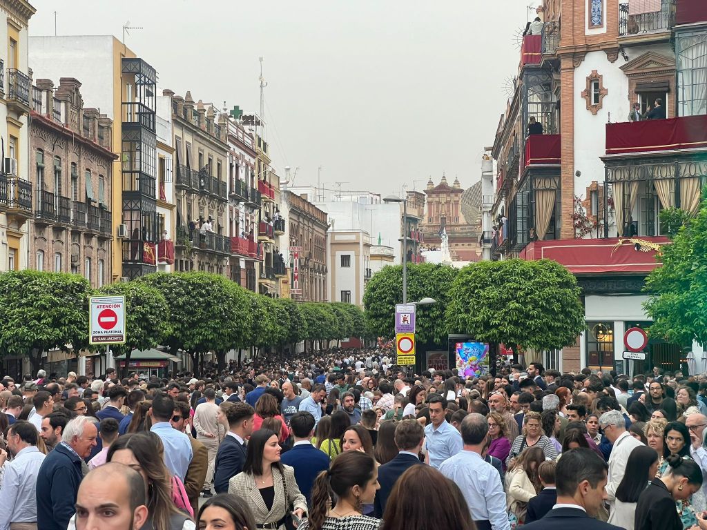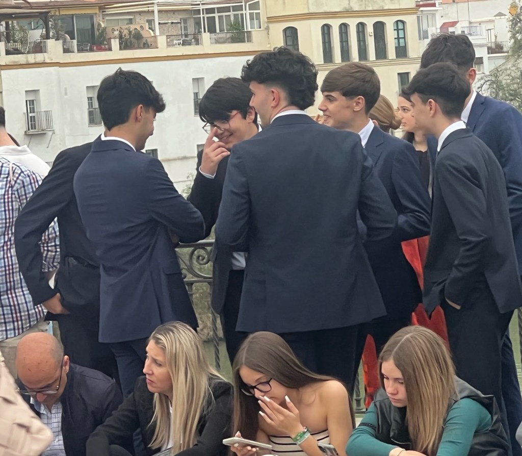 We venture into the streets crowds are building, a huge statue of the virgin Mary, Esperanza de Triana, is due to be paraded towards the cathedral and back again.We wait and wait .The young men are all dressed in dark blue suits and nicely groomed, incredible.Some people have been waiting since 430pm it’s now 6pm.We wait till 630pm the crowds are dense and thick with cigarette smoke plus the air is heavy with the prospect of rain and there is still fine sand still in the air.The bridge Isobel Puente feels as if its almost groaning with the weight of all the people. A brass band marches up the street in the direction of the church.The procession is meant to be impressive with nazarenos hooded figues walking in two lines with the float bearing the statue being carried by men that have practised for months for this honour. We do see 3 children dressed in white robes with their pointy hats also heading down the street. We give up, our appartment is close so I plan to rush out if we hear the noise of the parade.We keep checking out the windows, nothing then people are dispersing, it’s raining .Did we miss it?There are processions all week I’m sure we will, catch one.Apparently no processions in the rain as its too dangerous carrying the heavy statues.