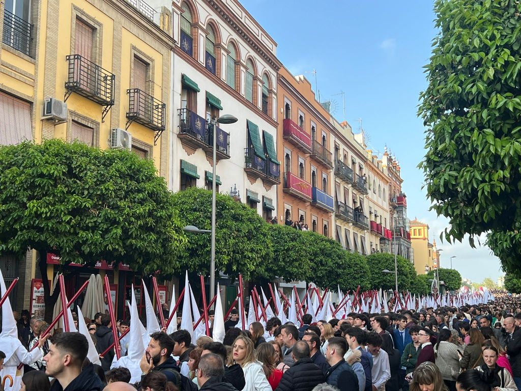 After 2 days sightseeing we were back on the road.Seville was a surprisingly walkeable city with beautiful buildings and gardens.We hadn’t realised we were in peak season being holy week as the Holy Week processions attract tourists from all over the world.By chance we had booked an appartment in Triana which is one of the easiest places to see one of the processions;starting with a brass band then 2 lines of Nazerenos dressed in white and white pointed caps carrying huge candles which they light on their way back from walking to the cathedral.Then comes the churches statue weighing 2 tonnes,40 men carry it , each person carrying 50kgs. I thought it would be a solemn affair but it was a party atmosphere and much clapping for the prowess of the men carrying it.Some processions also have women singing but not ours.