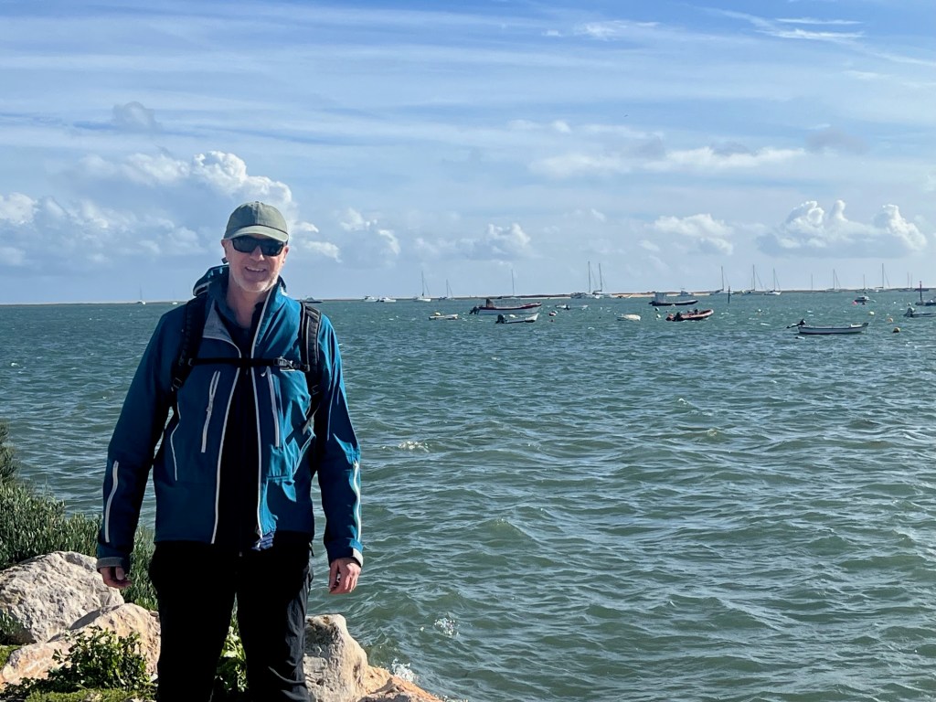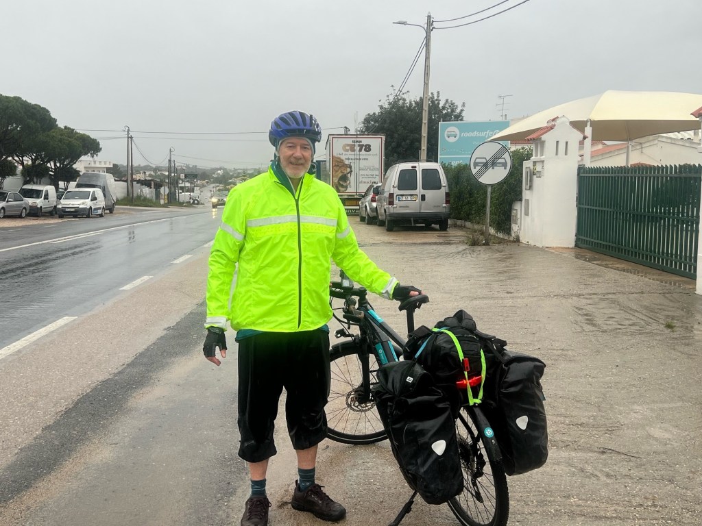 It was back into full rain gear and a reluctant set off out of Faro which took some time before we were clear of the city.We had good emergency lanes to cycle in and traffic was quiet it was going to be an easy day we thought apart from the rain. After 18kms we saw a bakery open and stopped to dry off a bit and have a hot drink.Off again but within 7kms the road went down to a single lane with no emergency lane and bollards in the middle of the road so vehicles couldn’t get past us,very dangerous. So we went in search of cycling roads and hoped they didn’t lead into dirt tracks which with days of rain would be a quagmire.We missed one cycle path and were cycling on a busy 2 laned road and started getting lots of toots.We realised we shouldn’t be on the road and there was the cycle path on the other side of the road,oops.Tim was very excited to see a Triumph motorbike shop, as he follows a utube called Rocket Man who buys triumph motorbikes from the Algarve Triumph motorbike shop.