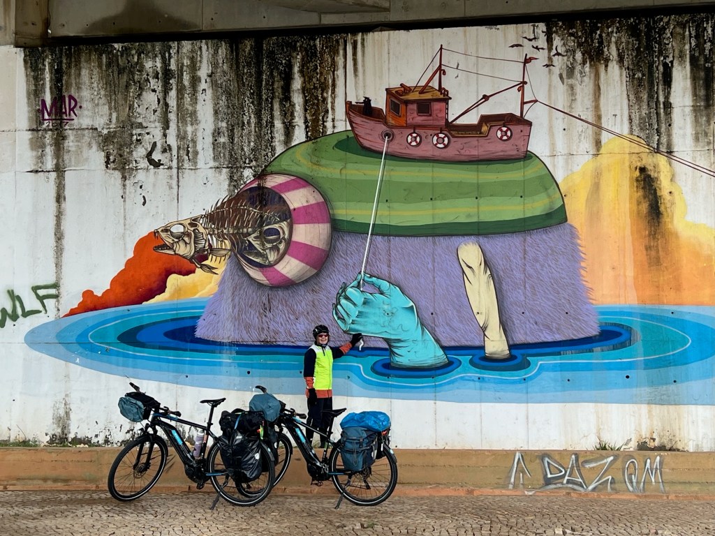 We passed through a small town of Ohlao and stopped for coffee there.The street art was spectacular whole buildings covered with different themes.The bakery was selling very solid looking round Easter cakes, similar to a simnel cake, but looked too heavy for us to carry.As we approached Faro we saw many derelict buildings, some looked like they were once really nice villas with pizza ovens etc.A lot were covered in graffiti and some especially as we went towards the centre, the graffiti turned into street art.We were unsure where we were so stopped for lunch at a small restaurant great food – pork cheeks, pork ribs.The owner was very friendly and offered a little some thing to finish our meal.Tim told me it was non-alcoholic I swigged it back and the world was spinning.No chance of me finding our hotel now,!