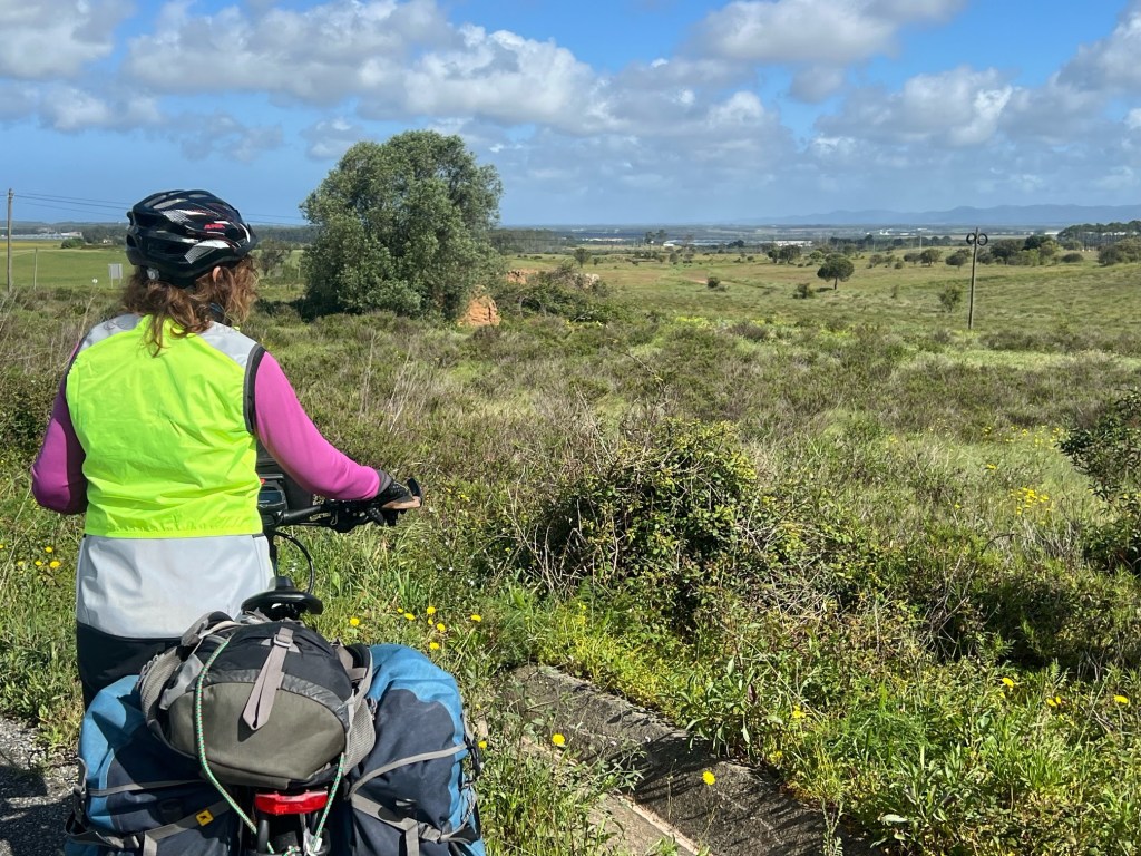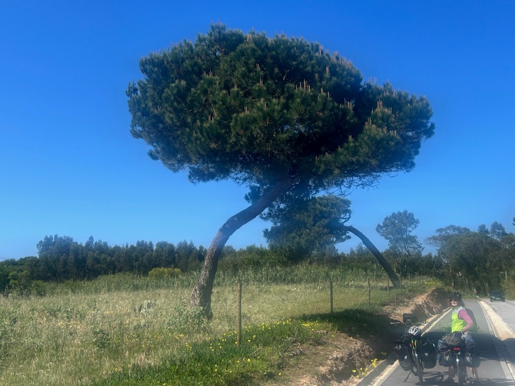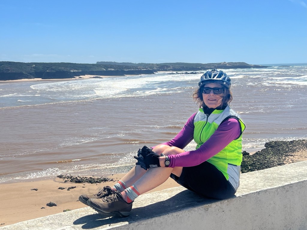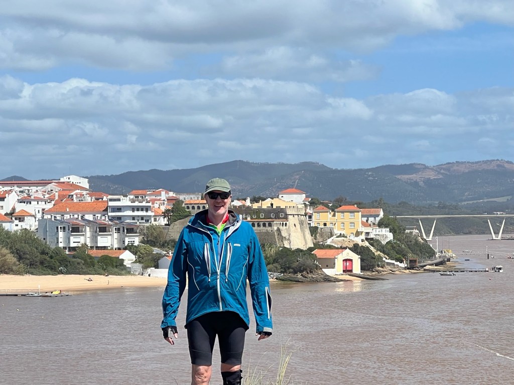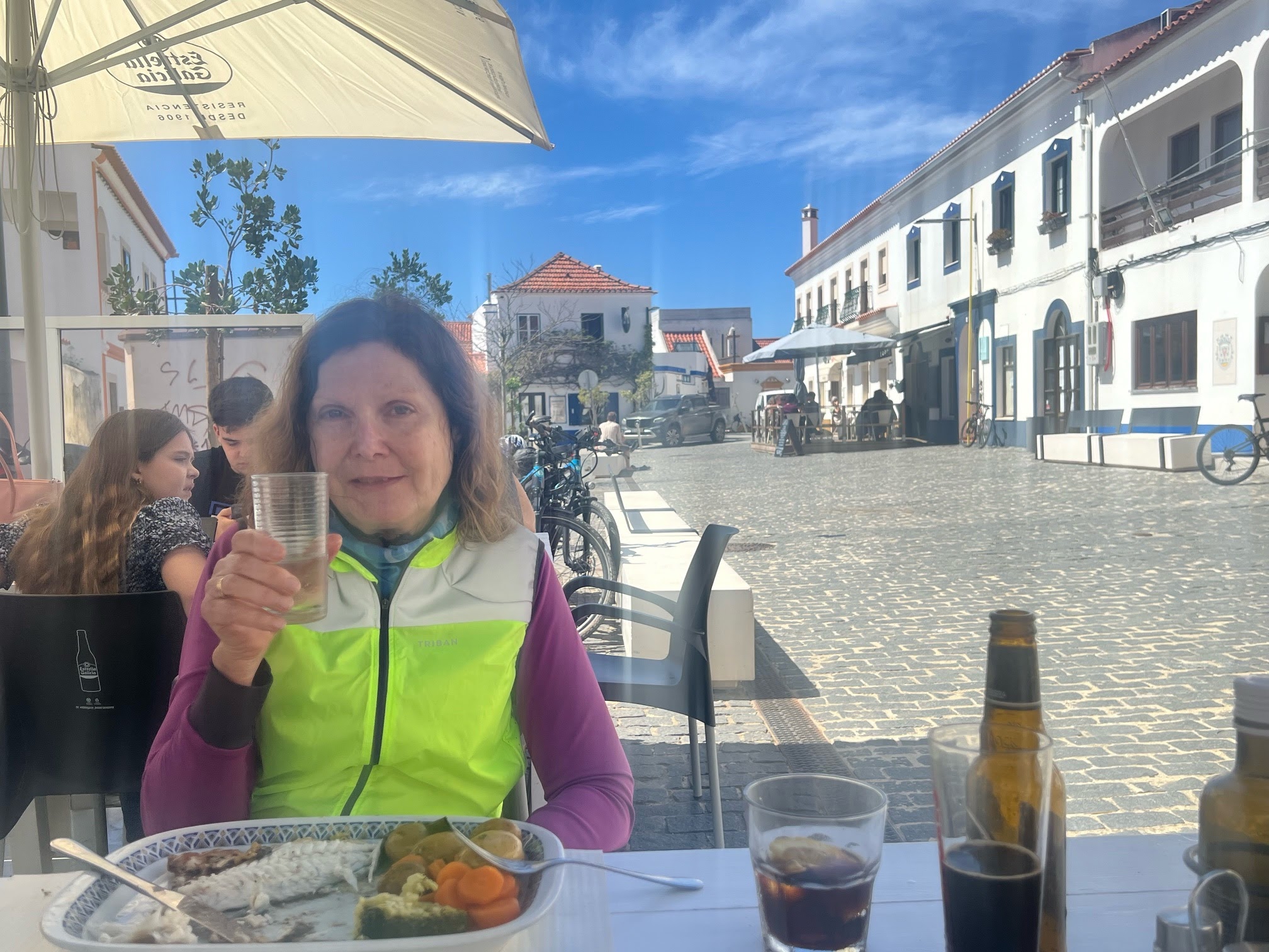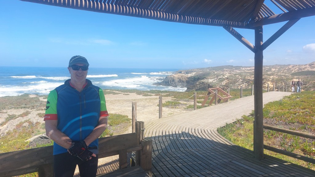 We woke to thick mist in Odeceixe, panic the e-bikes were parked outside in a lane way.Tim had tucked the terminals up but had any moisture got in?At least we had slept well the church bell chimes had stopped at 930pm.The e-bikes terminals tucked up with Tim’s socks and duct tape worked they were still ok. Our next issue was breakfast, no breakfast at the guest house so our host had said use the bakery, we walked to the local bakery.It was meant to open at 8am, well maybe Portugal is like Spain manyana.Someone else was already waiting, by the time it did open there were 5 more people behind us in the queue.They didn’t do rolls made up with ham and cheese, so we just grabbed some seeded rolls , croissants and tea and juice.The rolls must have been yesterday’s they were so tough I had to dip them in my tea to eat it and my teeth are perfectly OK! As we cycled over the River Seixe after leaving Odeceixe there was a perfectly good cafe, and it was open.