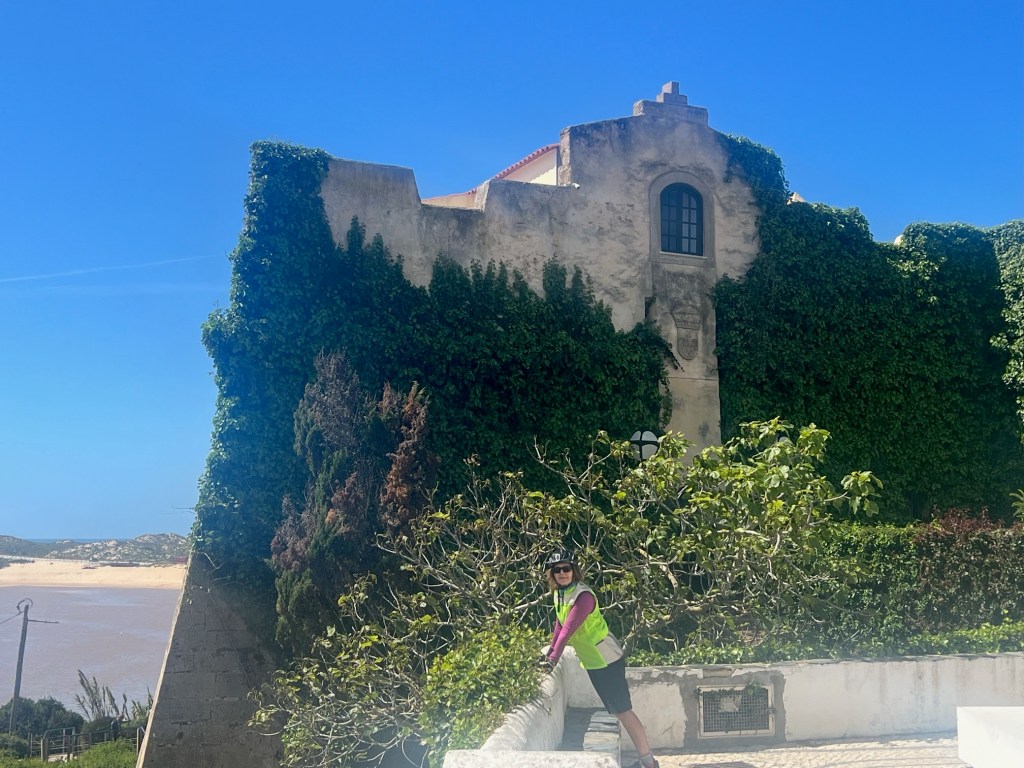It was off to Vila Nova de Milfontes our destination for the day.It was stunning cycling across the bridge of the river Mira seeing it open out into the sea, such a spectacular river mouth. We cycled into the pretty town with white walled houses and cobbles and settled ourselves into a restaurant set on the cobblestones and tucked into some fresh fish char grilled.What could be better?We cycled down to the river mouth and had a look at the fort Sao Clemente before heading to our hotel. The fort was built 1602 to fend off pirates.The ebikes are in an old gym tonight at Hotel HS Milfontes Beach.