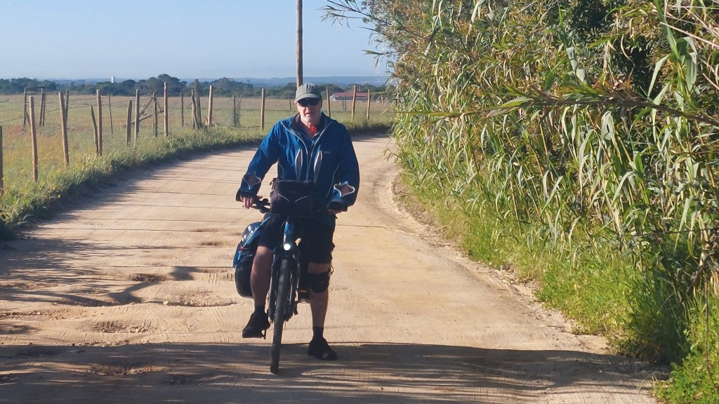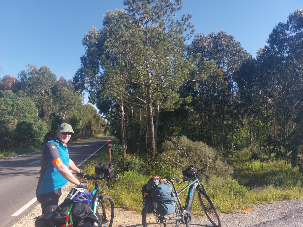 We were looking forwards to our sea view this morning but were greeted by thick mist, no view.Breakfast was good, walkers were tucking in and we also saw the 2 cyclists who had come and collected their luggage the day before, on a eurorad tour.Their bikes parked next to ours looked quite good but no engines, no wonder they had looked so tired the day before. As we set off Tim assured me the route was under control although I did say the route along the coast was dashed on our map which meant unsealed.Tim reassured me it was sealed, I didn’t think our map was that old and Portugal is not that fast at road sealing but…..Tim’s “map out” app then led us the wrong way down one way streets and of course finally onto an unsealed road with plenty of potholes to dodge.Some of it was quite compacted sand but most of it was nicely potholed and corrugated.This proved useful for Tim’s bike as that morning he had discovered he couldn’t turn his bike down to eco+ if he turned it up to normal. All that bouncing around fixed his electrics problem!