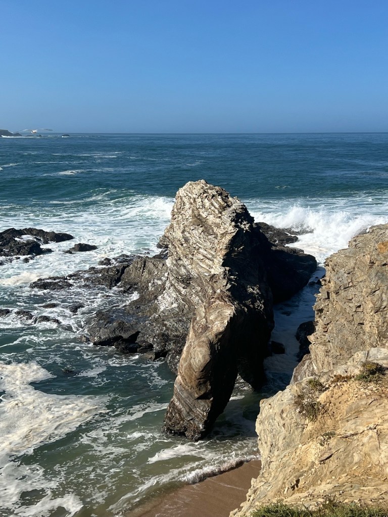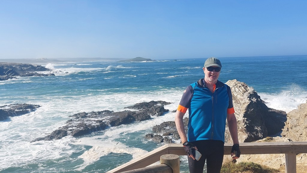 Finally we reached the bitumen which was a cycling route aswell but no emergency lane at all and a steep verge drop off so you couldn’t get off the road easily.This proved hazardous with the trucks hurtling past on their way to the port at Sines. It was a relief to turn off that road to see the beach at Porto Covo which seemed a real holiday town.The beach was quite wild with waves crashing onto rocks.We cycled back up the cobbled streets and stopped for coffee at the bakery to the delight of the 2 girls in there.They were able to practise their school girl English.From Porto Covo a cycle lane appeared on the road and Porto Covo itself was building a cycle lane down to the beach.I was just thinking no big hills today when we encountered 2 very steep hills so I won’t think that again.We passed quite a few touring cyclist going the other way.