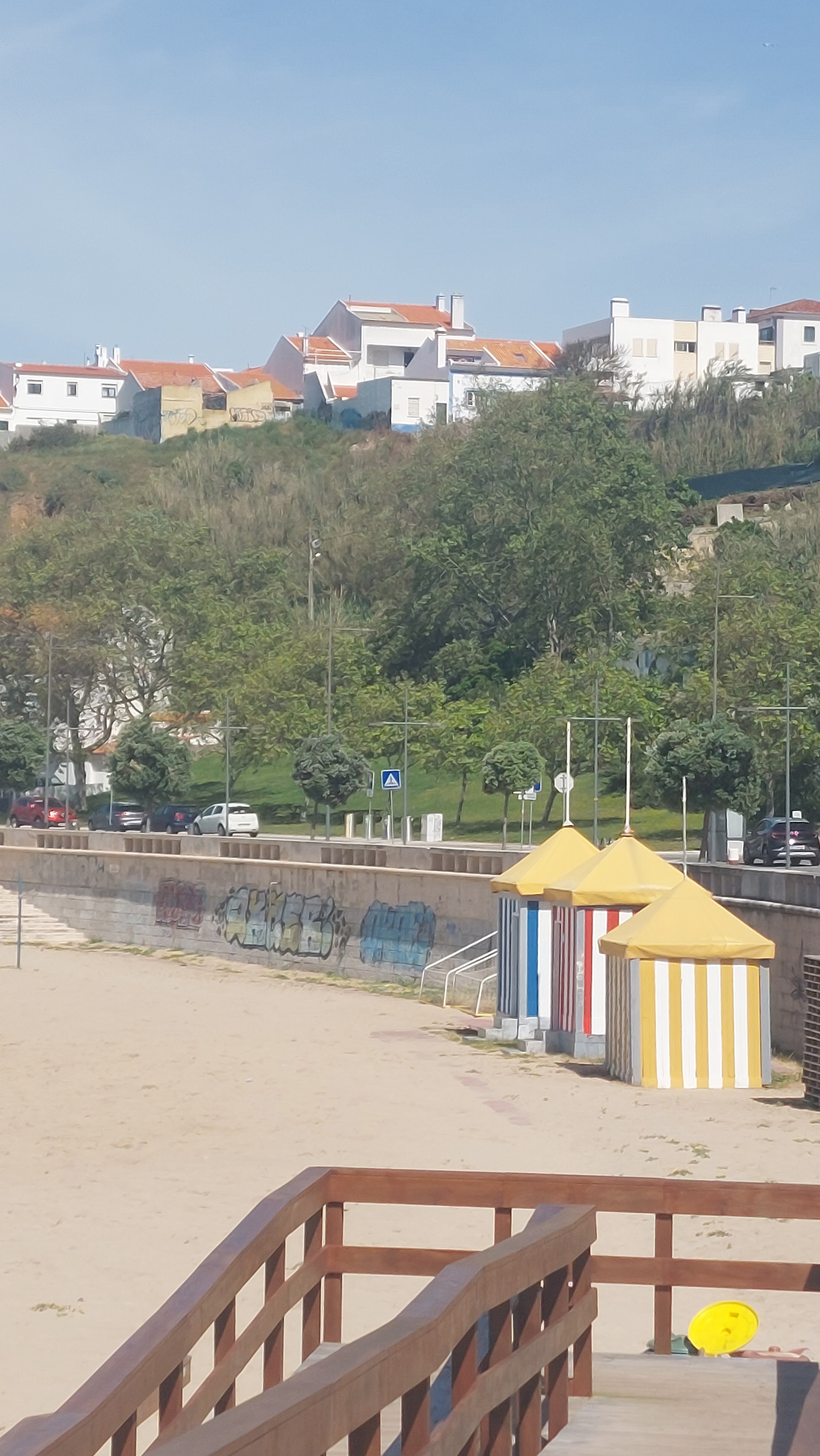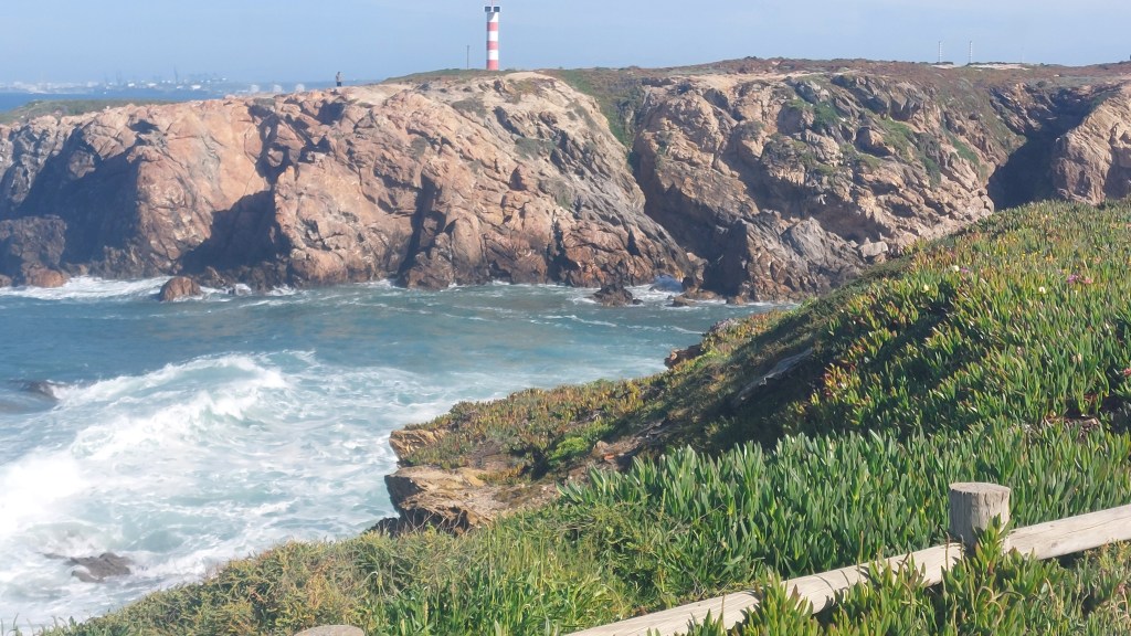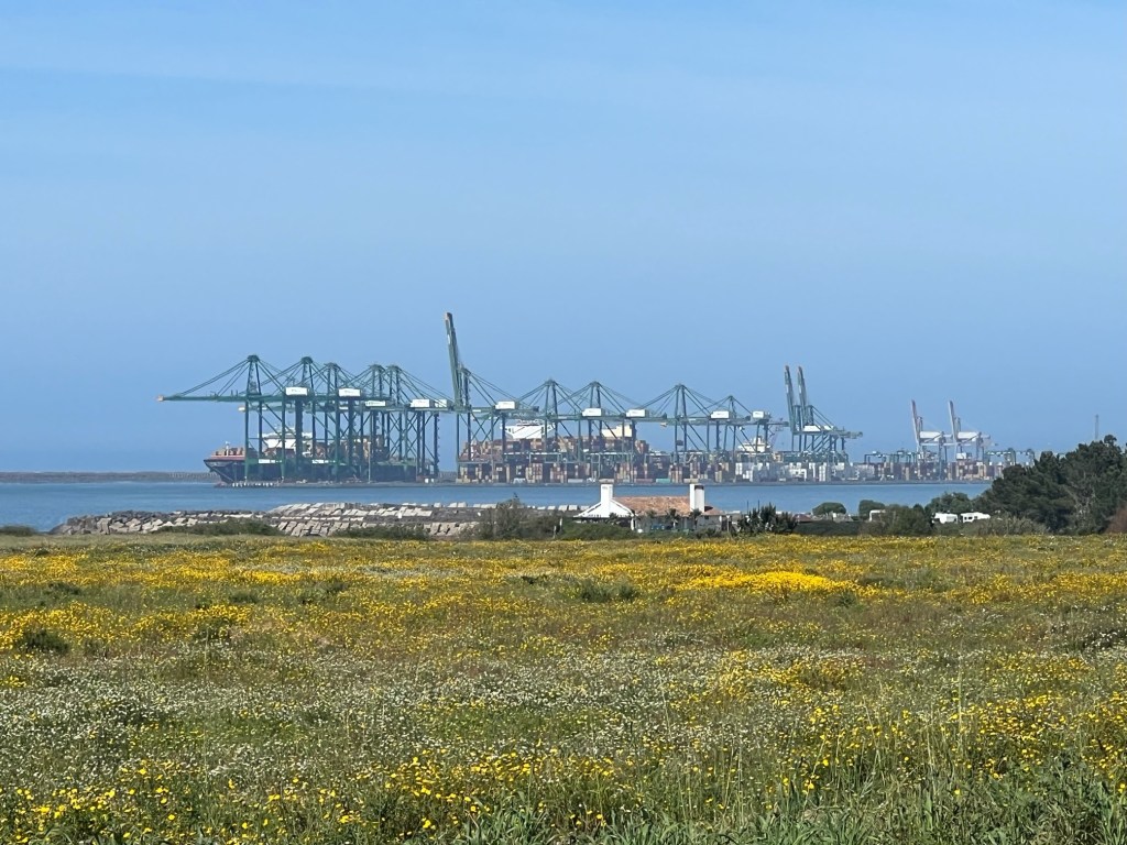 We peddled on towards Sines, having first to pass the large port and industrial area.The port of Sines is Portugal’s number one cargo port.The refinery in the industrial area produces gas,diesel,bitumen,LPG and sulfur amongst others.My eyes started stinging and running, then I was sneezing and then my chest tightening. All plans to visit the old town and castle of Sines were abandoned and we continued on out of Sines before I had to try and find which pannier had my ventolin in. Apparently today Sines only had moderate air pollution of particulate matter, I pity the poor locals.It must be hard for those walking this stretch of the coastline having to go up the dual carriageway past the port for kms in the pollution aswell. We did see quite a few walkers trudging along.TheVasco da Gama beach looked quite pretty with gaily covered beach huts. Vasco da Gama was born in Sines and spent a lot of his life trying to gain Lordship of Sines in recognition of all his navigational successes to India however in the end he was expelled from the town.The beach was named after him aswell as the school and a square.