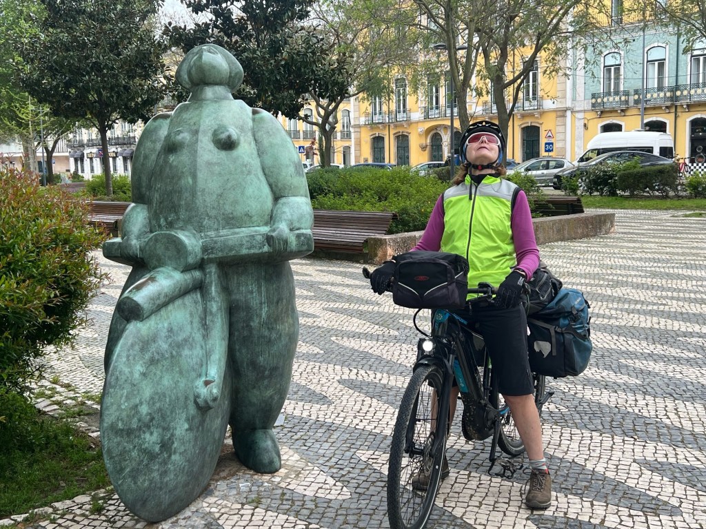 It was good to be leaving the high fliers resort I’m not sure we exactly fitted in wearing our bicycle gear.Tim likes to arrive at places like airports, stations well before departure time so we had a very fast 5km pedal to start our day to get to the ferry before it arrived. There was a bedraggled cyclist with his panniers and tent who just muttered something about crap weather and didn’t want to chat.The ferry took us to Setubal with all its charm and tall Portugese tiled buildings. As our route was quite rural today we stopped for a coffee and tea first.It was great to be paying normal prices.I had the most expensive cup of tea I had ever had in Troia, 7 euros 20.ie.12 aussie dollars.The cycle lane in Setubal took us through a sculpture park which was quite fun before we tackled the serious stuff of climbing out of Setubal.