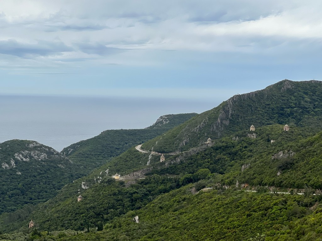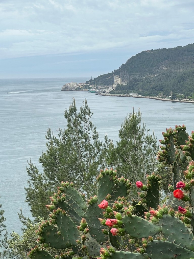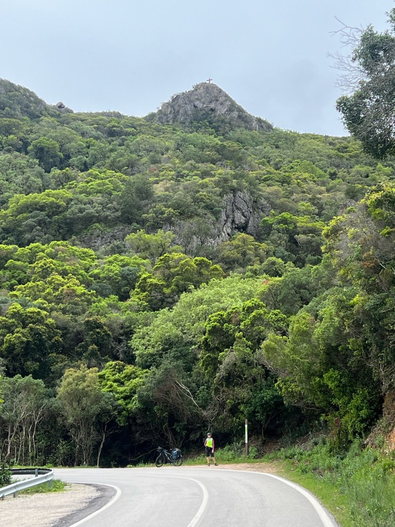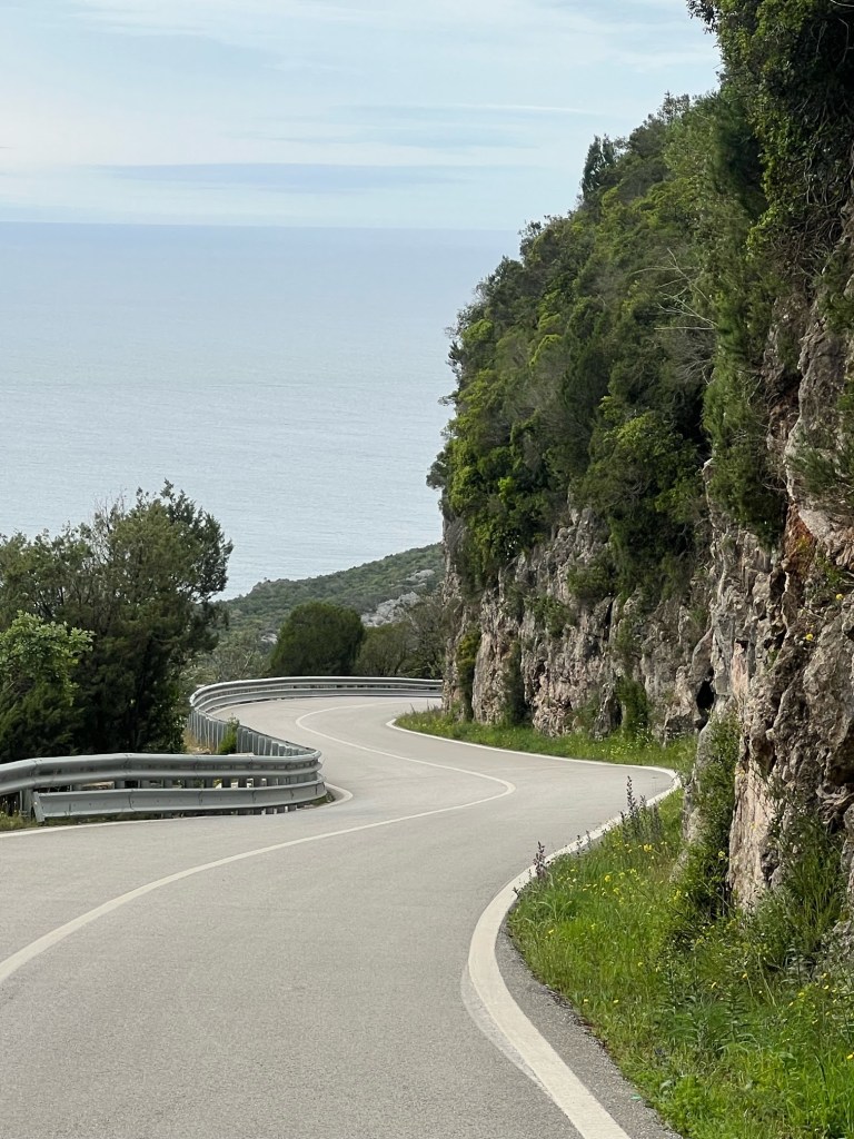 This was meant to be a gentle day for us but on verifying Tim’s route on google maps we discovered part of the coastal road was closed till Jan 2025.This meant the hilly route with narrow roads.Fortunately the only cars using it were sightseers who were happy to take their time to pass you.It was Saturday so there were groups of fast cyclists shouting out comments like “Go bro” to Tim and “go,go,go” to me as I frantically peddled to get up the next rise.It was fun time for motorcyclists aswell whizzing around the hairpins.I was slowly peddling up an unending hill when I came fact to face with a huge camera, if I stopped I would never have got back on the bike with the hill being so steep.So I am featured on somebody’s video with a great recording of 3 motorbikes leaning over then he gets me as he turns to follow them down.Sorry.