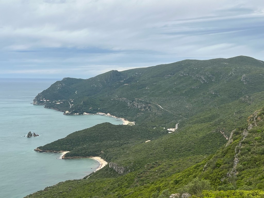We finally reached Sesimbra and started descending into the town.I had no idea where our appartment was so we stopped for lunch at a really small Cafe with a lunch sign out the front.This was entertaining as we could have either meat options or fish options.We chose fish; she then brought out 3 whole different fish on a plate so we could choose what we wanted.I chose the fish with the brightest eyes, from my working in a fish shop days, no idea what it was.Then the proprietar asked or rather pointed at her limited menu what did we want with our fish? I knew potatoes and mixed salad so that’s what we got.This gave us time to work out how to get to the appartment.It was the other end of town and we were early.A good opportunity to go to the beach so we sat under a coconut palm leaf beach shelter and had drinks pretending it was warm and sunny.We couldn’t start beers as we still had to get up a very steep hill to our appartment. So steep I wasn’t in the right gear and rather than mangling my chain got off and wal,ed, luckily walk mode changed down into the gear I’d selected at the last minute.At the allotted time we returned to the gated complex of appartments and I phoned up on my local sim on my old phone and managed to understand that Irene who looks after the appartment would be with us in 2 minutes with the key.